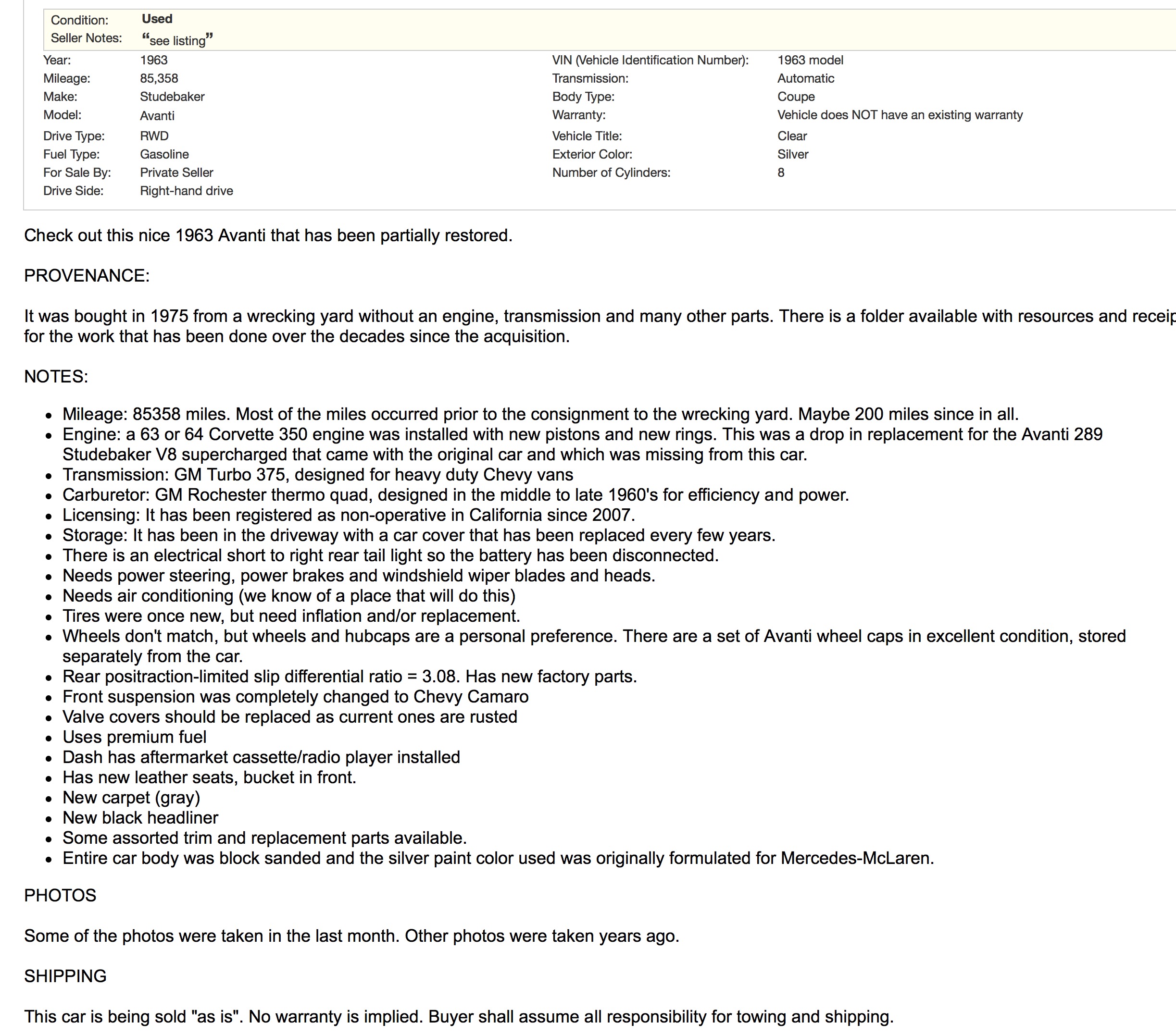 1963 Avanti Serial R-1247 Body 63RQ-416