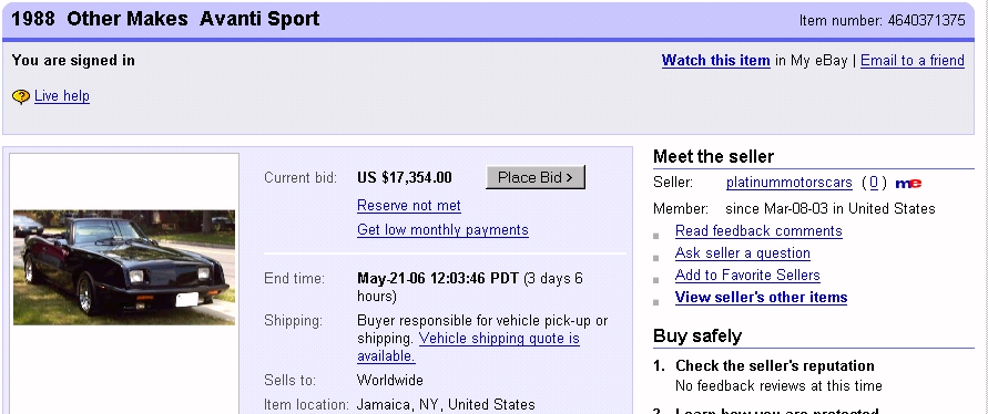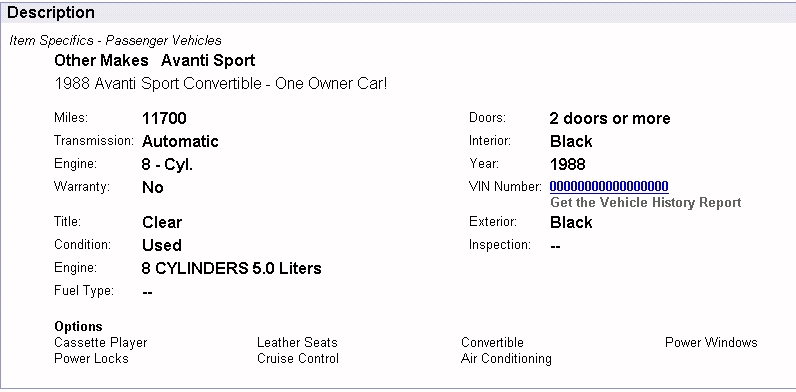 Bob's Studebaker Resource Website 1988 Avanti AAV-0293 - February 2005 Ebay Listing