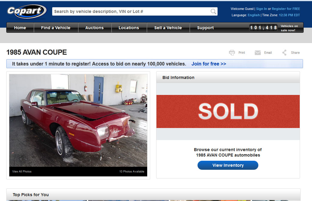 Bob's Studebaker Resource Website 1985 Avanti on Copart.com Location - Florida - July 2014