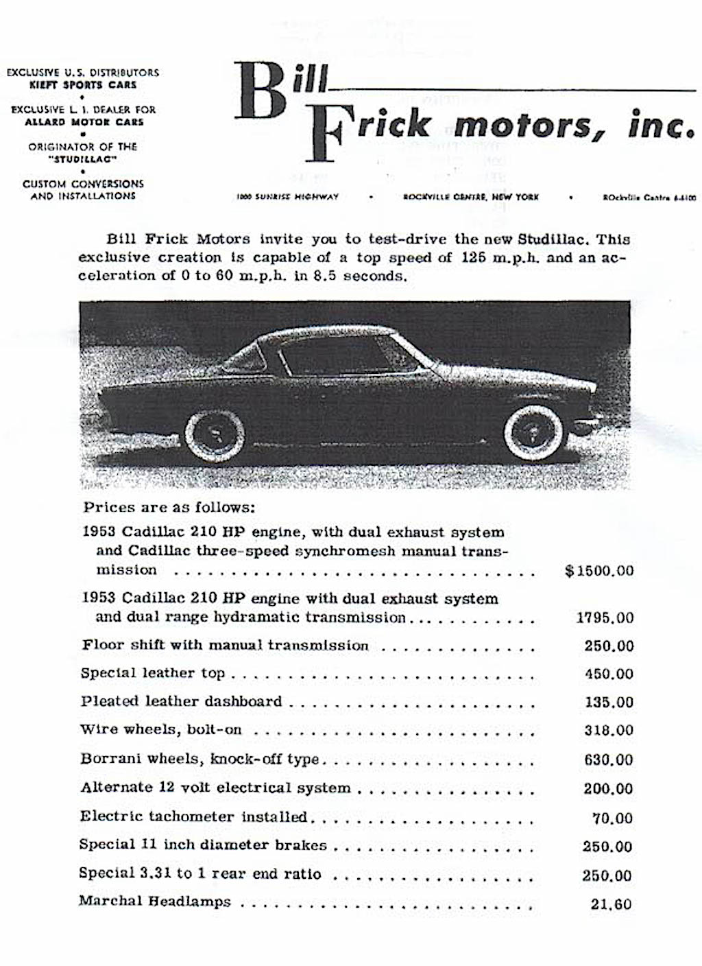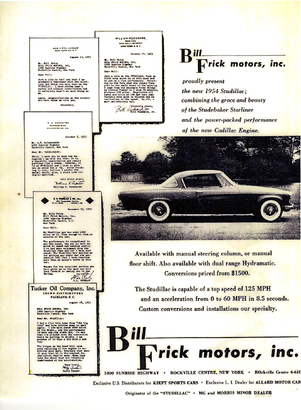 In 1953 Frick started to produce Studebaker Starlight and Starliner coupes that were powered by the 210-horsepower Cadillac engines. The modified Studebaker was named Studillac. According to the ad for the 1954 Studillac, the Studillac combined the grace and beauty of the Studebaker Starliner with the power-packed performance of the new Cadillac engine. The Studillac was available with a manual steering column, or manual floor shift. It was also available with dual range Hydramatic. The conversions were priced from $1500. The Studillac was capable of top speed of 125 MPH, and it had an accelration from 0 to 60 MPH in 8.5 seconds.