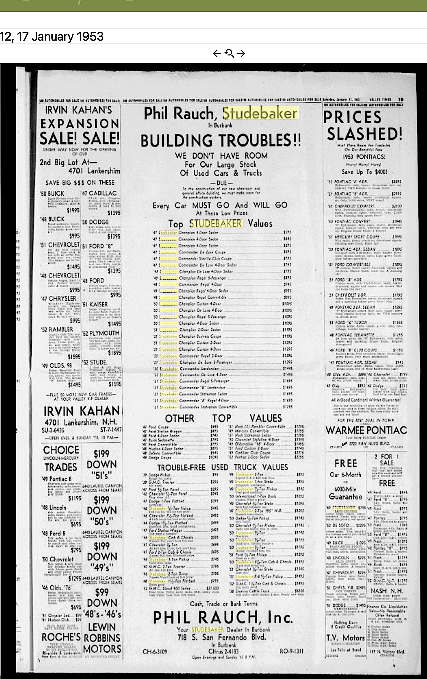 Village Studebaker,   \ 3029 W. 48th St.\   Los Angeles, 8, CA       ( studerich - SDC Forum - Oct 2006)     (C 1955)           (23012014)      (C 1964)     (R.Quinn 1964p44 - Archive March 2015)