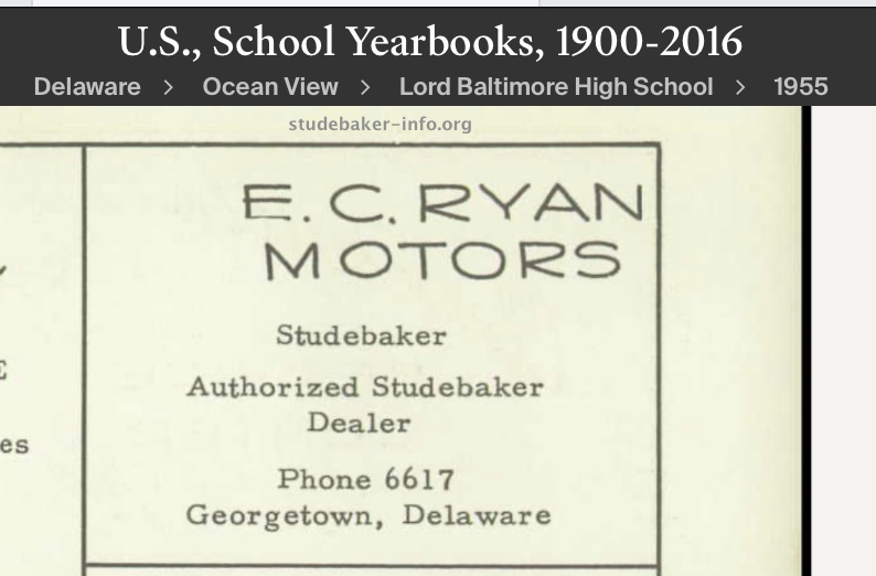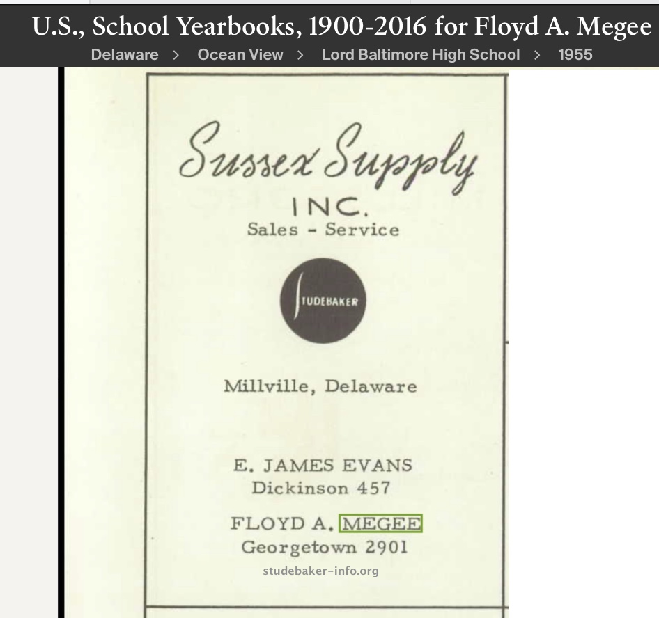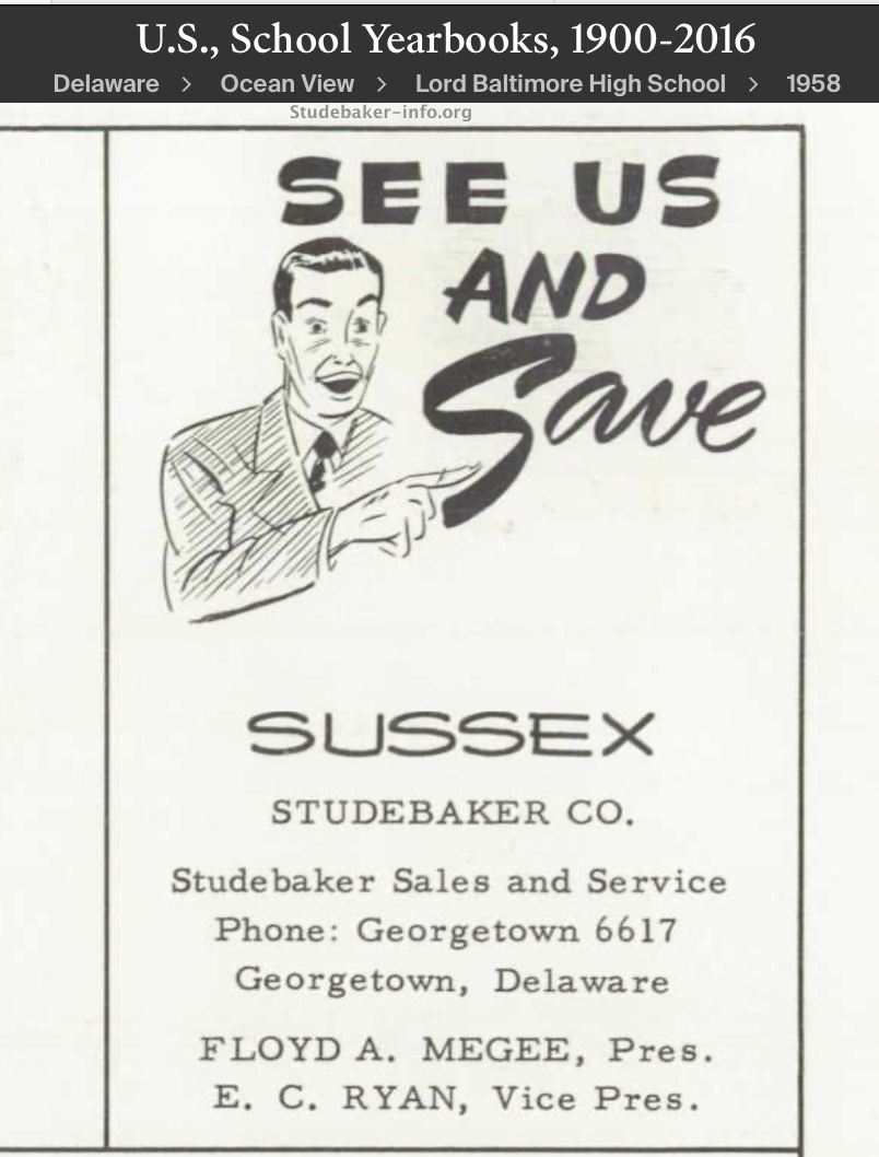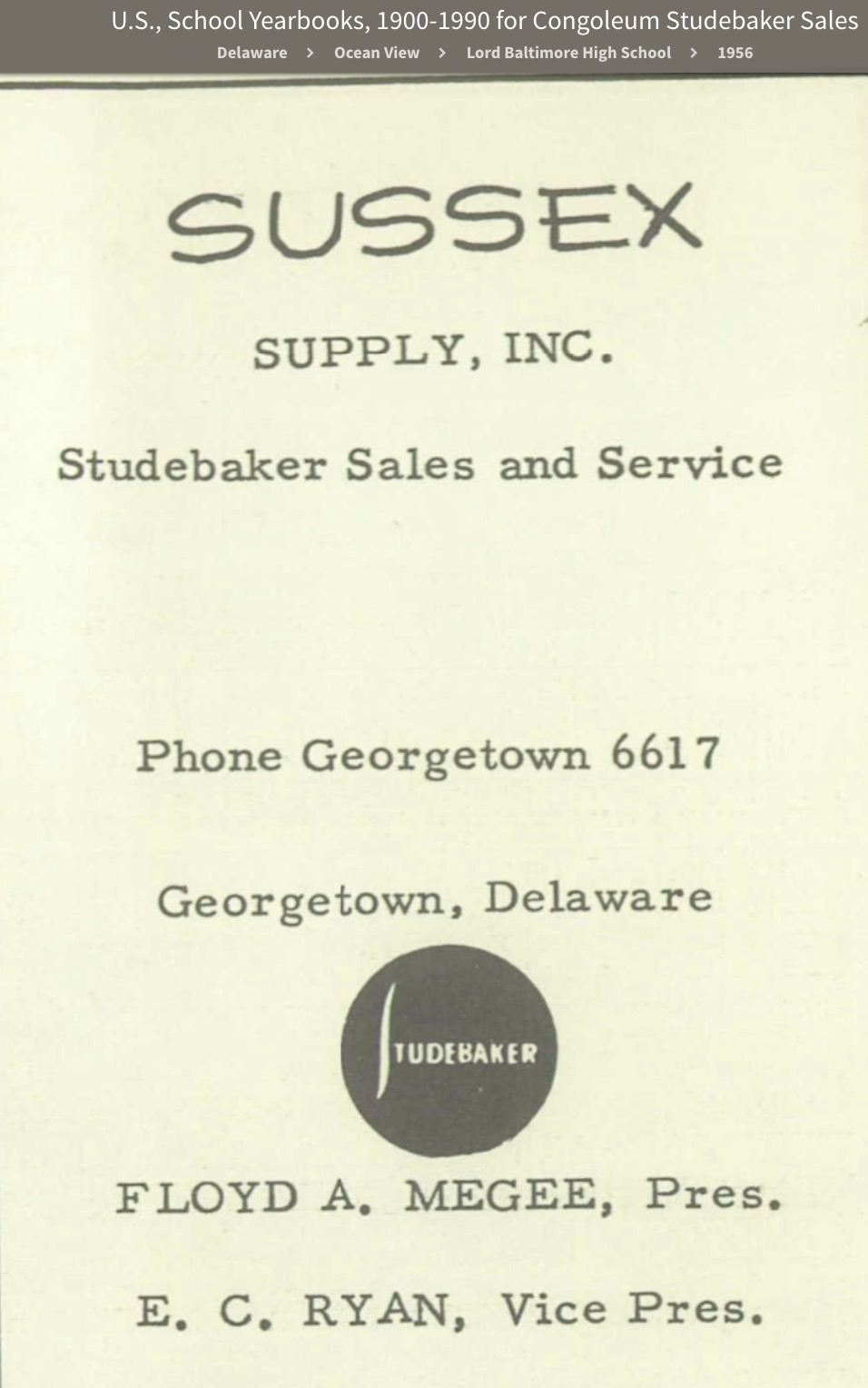 Sussex Studebaker Co. Georgetown DE - E.C. Ryan sells his shares to Elwood Steele new partner with Floyd Megee name changed to "Sussex Studebaker Co." Yrs of operation -1958 - 1963 as Studebaker.