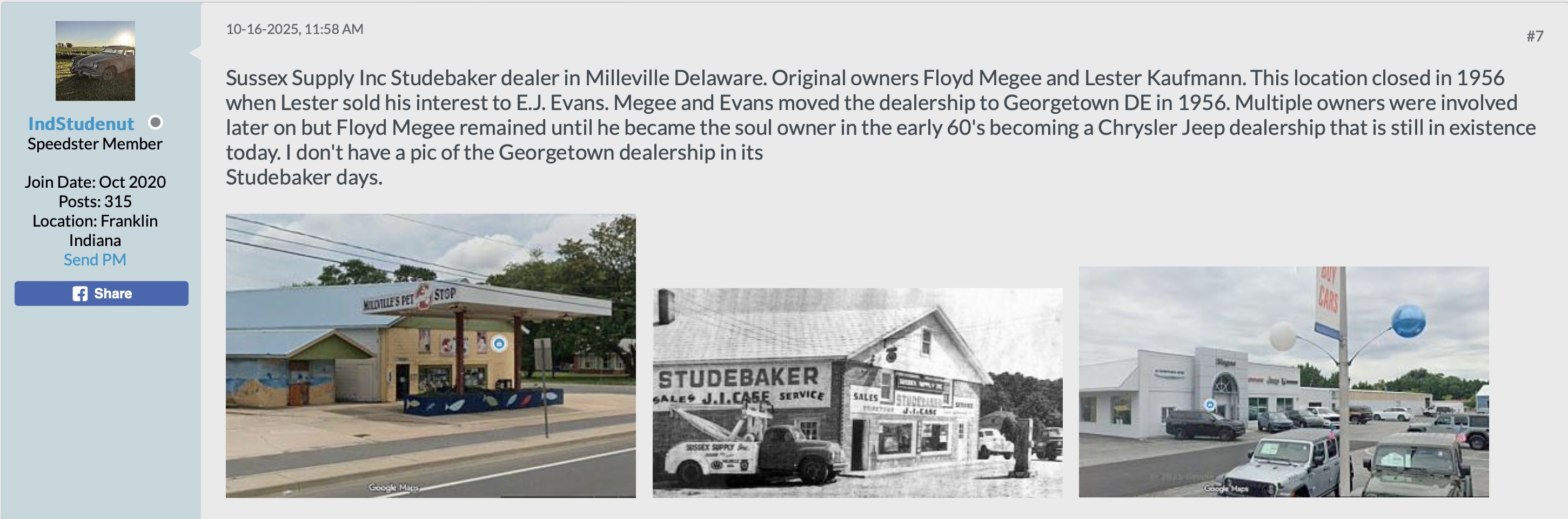 Lester Kauffman Studebaker Millville DE - The real name was "Sussex Supply Inc" in Millville DE (See attached picture of the Millville dealership) Yrs of operation - 1948 - 1955 Lester Kauffman/Floyd Megee partners