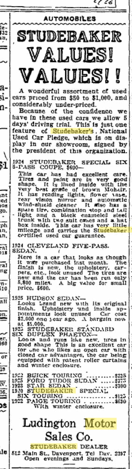 Schultz Bros., Studebaker Sales & Servce, Titonka, IA / Ref 1950 (28122018) Schultz Garage, Algona, IA (C 1951) Ref... ; (C 1952) Ref... ( 25 Feb 2013) 1957 ( 16122018) Scofield & Bateman, (Wagons) La Porte City, IA (C 1896) Ref... ( 25 Feb 2013) (The) Schrup Motor Car Co., Dubuque, IA (C 1913) Ref... (03 Dec 2012) Schultz Brothers Studebaker, Algona IA Tel 975-R / 975-W ![]() Shawhan Motors, \ 1701 East University\ ![]() Shawhan Motors, \1311 Keosaqua Way\ ![]() Schee Motor Co., \ Grand Ave.\ ![]() ![]() ![]() Schubert & Scholfield, (Wagons) La Porte City, IA (C 1894) Ref... ( 25 Feb 2013) Seaton & Davis, \ 9 East 3rd St.\ Spencer, IA (C 1951) Ref... (02 Feb 2013) Sherman Motor Co., (Phone 52) Sheldon, IA (C 1950) Simonson Bros., (Farm Service Station) \ Hwy 17 \ Graettinger, IA (C 1940) ![]() (The) Simpson Motor Co., \ 608 Nebraska St.\ Sioux City, IA Ref. (C 1953) (07082017) Sinkey Garage, (Jake Sinkey) Ireton, IA (C 1940) Ref... (C 1947) Ref... (C 1939) Ref... (C 1950) Ref... ( 25 Feb 2013) (The) Sioux Rapids Auto Company, Sioux Rapids, IA (C 1913) Ref... Source.. (11 Jul 2012) The Sixth Street Garage, Boone, IA Ref 1923. (07082017) Also see The H.C.Payne Auto Co Spirit Lake Motor Co., (Mitchell Bros.) Spirit Lake, IA (C 1916) Ref... (04 Mar 2013) Also see Roff, Thompson & Roff Sporleder-Harlan Motors, Hampton, IA (C 1951) Ref... ( 24 Feb 2013) Stearns Auto Co., \ Main St.\ Mt. Vernon, IA (C 1915) Ref... (26 Jul 2012) Source.. (The) Studebaker Corporation of America, (Custer Ramsley) \ 424 Court Ave.\ ![]() ![]() (The) Studebaker Garage, Fayette, IA (C 1948) Ref... (21 Feb 2013) Studebaker-Mercedes, Waterloo, IA ![]() Studebaker Sales & Service, (Phone 491) Pocahontas, IA 1959 (16122018) Studebaker - Waterloo, \ 512 Jefferson St \ Waterloo IA 1964 ( R.Quinn - 18112024 ) Superior Garage Implement Co., (Ostheimer & Ostheimer) Superior, IA (C 1917) Ref... (04 Mar 2013)