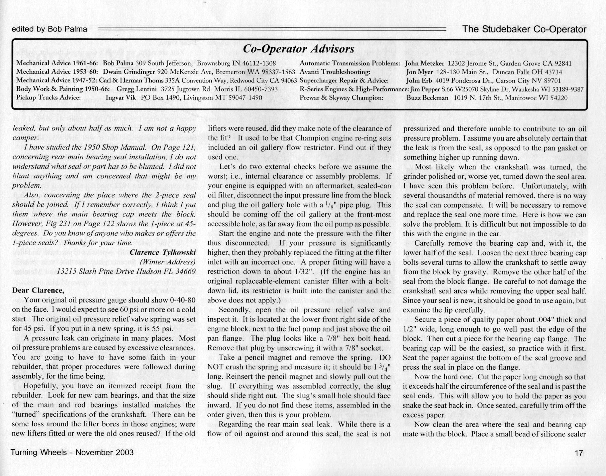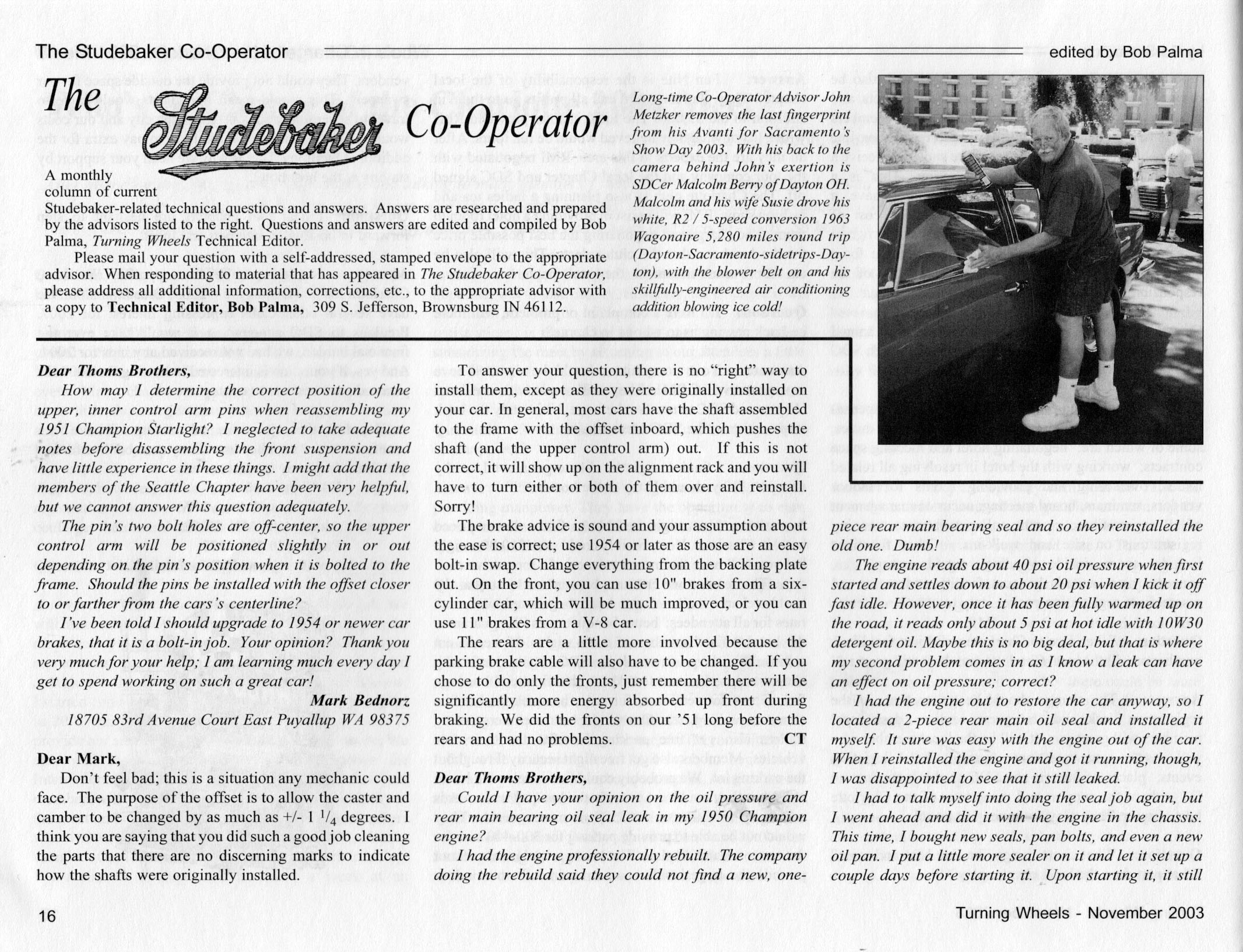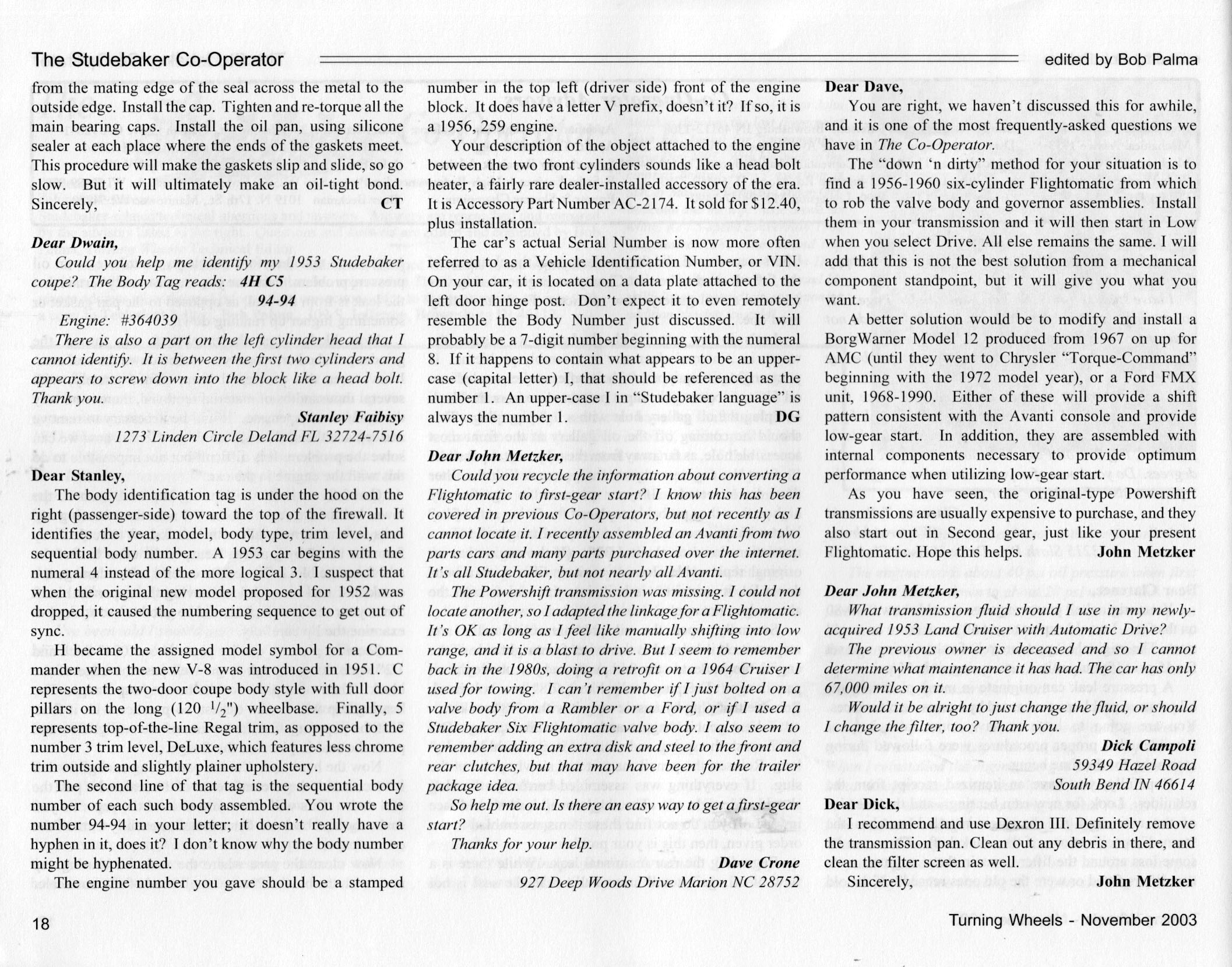 Bob's Studebaker Resource Website The Cooperator Turning Wheels, November 2003