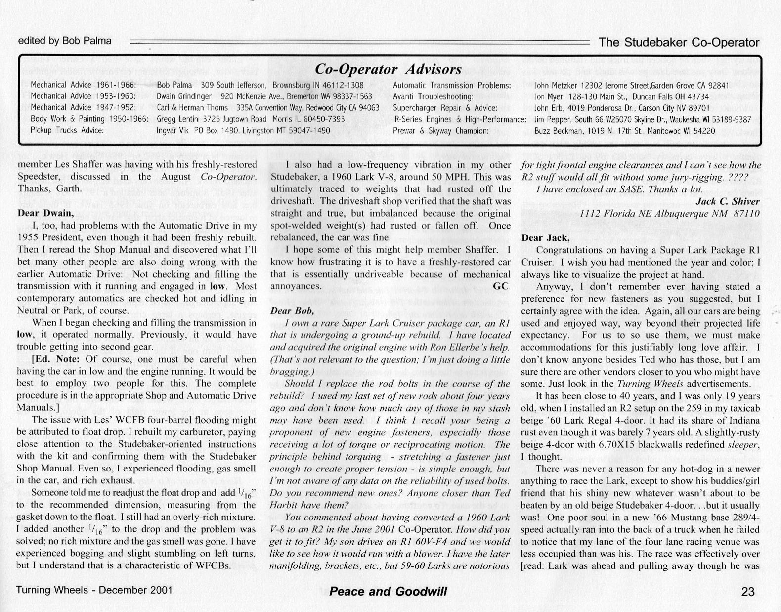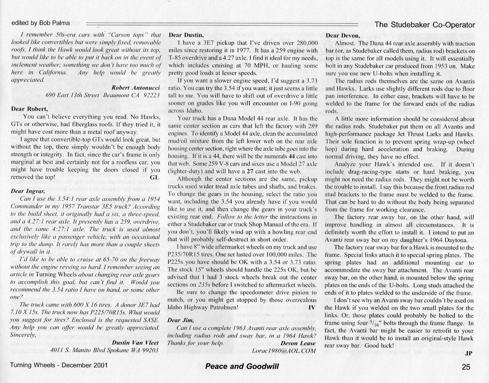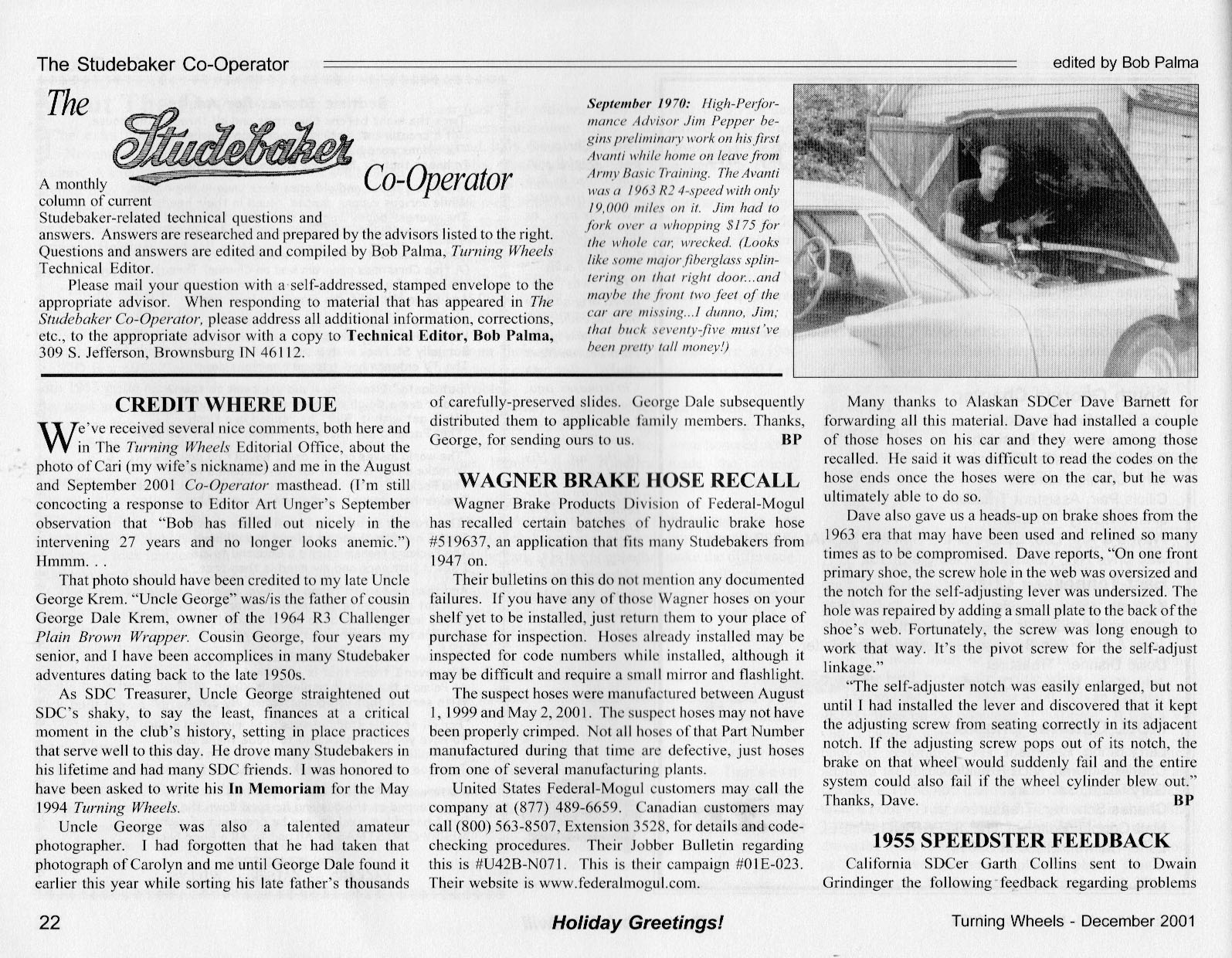 Bob's Studebaker Resource Website The Cooperator Turning Wheels, December 2001