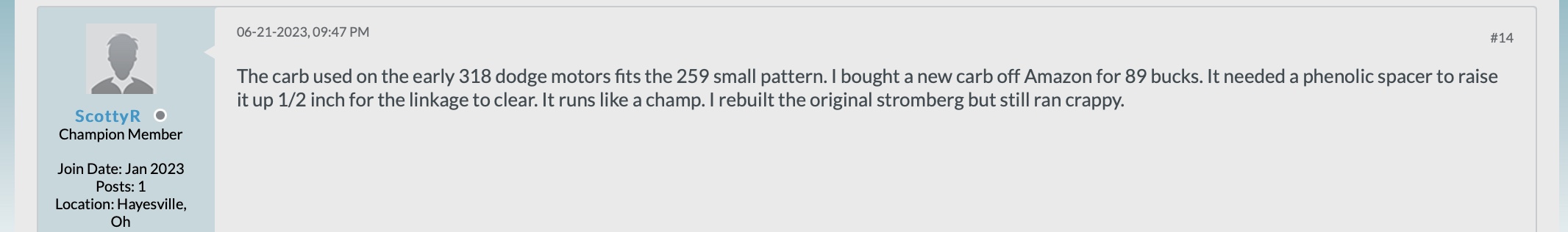 Dodge 318 Carb to Stude 259