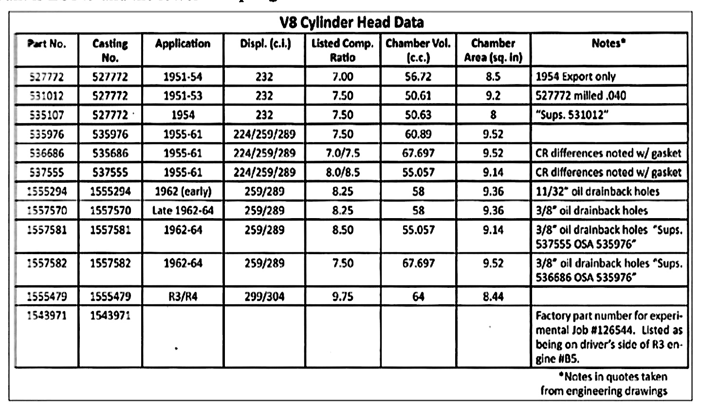 259 or 289 has the same casting number head as the R2. With flat top pistons, the 67 cc (Casting 1557582) will give you about 9.0 compression and the 54 cc's ( Casting 1557570) about 10.25 or with dish 289 pistons about 7.5 and 8.5 respectively with the beaded steel head gaskets. The 67 cc's ( Casting 1557582) came on some trucks also and the 54 cc's ( Casting 1557570) were on most of the '63, and '64 cars and a few of the '62's. Casting 1537555 = 8.0 used on '55-'62 with composition head gasket and about 54.5 cc> Casting 1557582 = 7.0 supposedly used on some trucks and are also the R 2 with 67.7cc Casting 1555294 =7.75 used on '62 with the composition head gasket