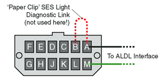 Generation El Camino CCC systems. This is the 1981 Assembly Line Diagnostic Link (ALDL) In order to pull the stored codes do this: 1. With the ignition off, jumper the two far right terminals as shown in the picture. "D" is the diagnostic terminal and "E" is ground. 2. Turn on the ignition but do not start the engine. 3. The SES light will begin to flash a Trouble code 12. One flash, a short pause, and two flashes. There will be a longer pause and the Code 12 will repeat two more times. 4. The stored Trouble Codes will now flash. Each Code will be repeated three times. Write them down. 5. When Code 12 flashes again that indicates that there are no more stored Trouble Codes. Diagnostic