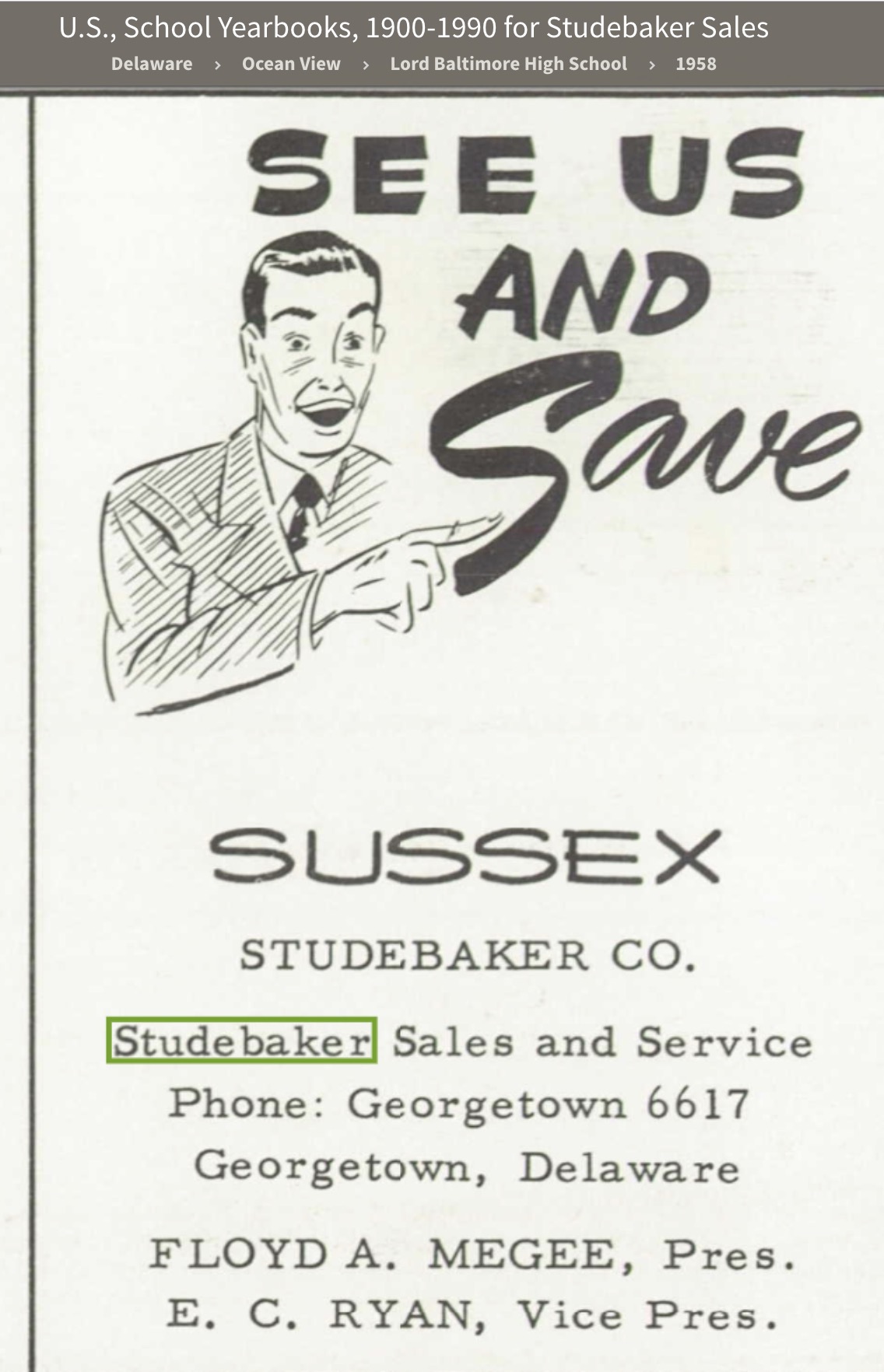 Sussex Studebaker Co. Georgetown DE - E.C. Ryan sells his shares to Elwood Steele new partner with Floyd Megee name changed to "Sussex Studebaker Co." Yrs of operation -1958 - 1963 as Studebaker.