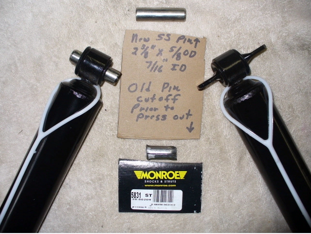 I love it when the Karma from the Studebaker Heaven come together. Thanks to Nate Nagle's page https://www.georgiastudebaker.com/Interchange.pdf I found the correct shocks and ordered them. Thanks again Nate!! Four shocks shipped to my door (Sensa Trac) $84.67 including 5% discount from Rock Auto. With the $25 rebate Total - $59.67 Huzzah - Huzzah. I purchase a lot from our suppliers but this is too good a deal to pass up. The rear shocks needed to be modified by replacing the upper pin with a 2 3/8" X 5/8" OD (7/16" ID) cylinder. I machined mine out of stainless steel. Be sure to cut the original pin off and use the new cylinder to push it out after lubing the new cylinder. A shot of the whole deal. Part #'s 5759 front, 5831 rear.