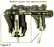 The same thing that allows the valve to fail is what will allow us to check it - the cap screw vent hole. First determine if the valve is a good candidate by its external appearance. If the outside of the valve and especially the cap screw are corroded then it is a good candidate. Remove the rubber mushroom from the cap screw. Next insert a paperclip so that it bottoms out in the piston as in Figure 9. Have an assistant start the vehicle and apply heavy pedal pressure to simulate a panic braking situation. The paperclip should push against you and travel about 1/32" to 1/16" as the piston moves. If the paperclip doesn't move the piston is seized in the cap screw and the valve will have to be replaced. This test will work on any proportioning valve that is vented through the cap screw and should be part of your normal inspection if the valve's exterior condition merits it.