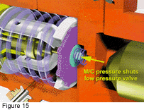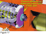 The metering valve consists of the following main components - stem, diaphragm, spring, seal and retainer and low pressure valve (Figure 14). Metering valve operation takes place in three stages. When the brakes are first applied the low pressure valve closes off the passage to the front brakes (see Figure 15). Once the pressure in the system is high enough to overcome the return springs in the rear drum brakes it also is high enough to just open the metering valve (see Figure 16). This is known as the blend pressure. Once the metering valve starts to open and pressure is allowed against the diaphragm, the difference in pressure on each side of the diaphragm causes the valve to fully open (see Figure 17). At this point both the disc and drum brakes will apply at the same time and balanced braking will be achieved. Unlike the proportioning valve, the metering valve works every time the brake is applied.