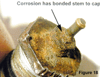 The design of some proportioning valves allows two things - more chance for failure and an easy way to diagnose them. If we take a look at the proportioning valve in Figure 6 we will see the cap screw that holds the piston and spring in place is vented. In the vent hole is a small rubber "mushroom" that is supposed to prevent any moisture from entering the cap screw. If this style of valve is mounted low on the vehicle, as in most rear-wheel-drive vehicles, it can be exposed to a high degree of moisture. This is especially true where road salts are used for snow and ice removal. The moisture can corrode the cap screw and allow water to enter into the area where the piston travels in the cap screw (see Figure 7). This causes the inside of the cap screw to corrode which bonds the piston and cap screw together (see Figure 8.). Normally when the cap screw is removed, the cap screw, spring and piston are separate pieces. This corrosion prevents the piston from moving when a panic braking situation occurs.