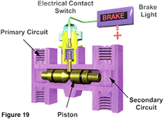 If the vehicle experiences a hydraulic leak or failure of either the primary or secondary half of the master cylinder, a difference in circuit pressure will be created. The pressure from the functioning portion of the hydraulic system will force the pressure differential piston toward the side with the pressure loss. The movement of the piston will cause the electrical contact switch to go from open to closed as in Figure 20. This will complete the ground circuit to the red warning light and will illuminate it.