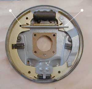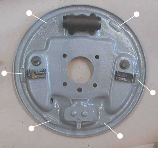 ![]() Put a smear (NOT A GOB) of white lithium grease on these spots or comparable ones on other brake style backing plates, This allows the shoes to slide easily on the raised backing plate lands |
