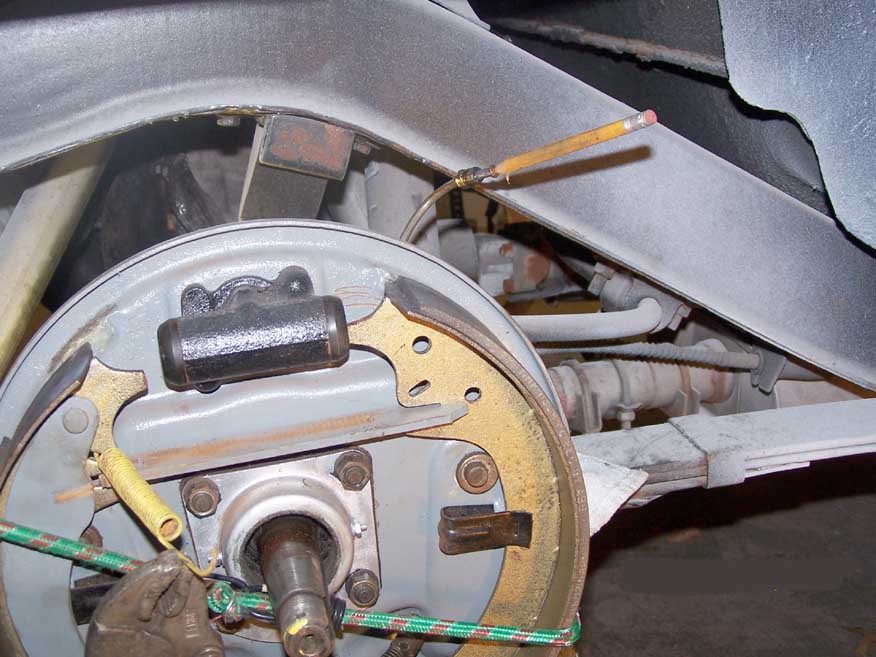 ![]() If you're R&R'ing the wheel cylinder, plug the line with a "pointless" pencil/ It holds the fluid back nicely and minimizes bleeding later |