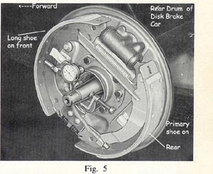 Replace the shoes. Remember that, on a Studebaker with Disk Brakes, the primary (short) shoe goes on the REAR. The longer secondary shoe goes toward the front. See shop manual pic below NOTE: This scan is from the shop manual and shows the long shoe on front. The shop manual refers to the shoe with the longer lining, as the "Forward shoe" and the rear shoe as the "Reverse shoe". |