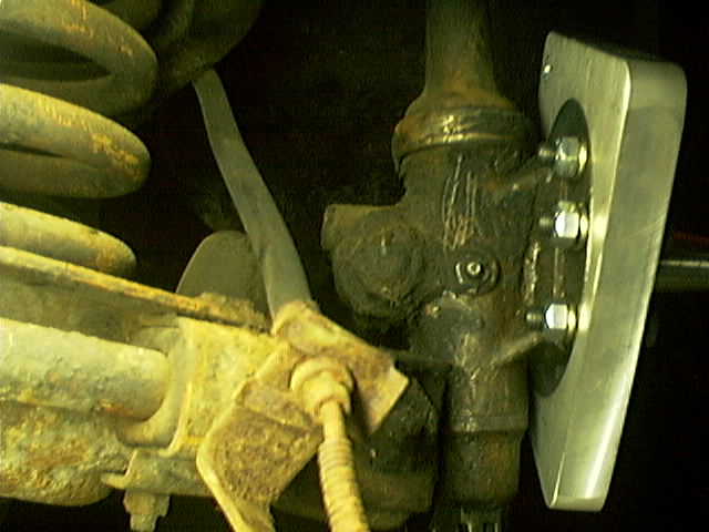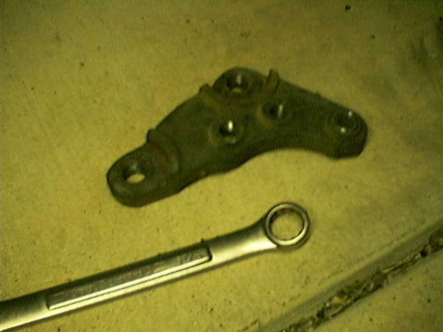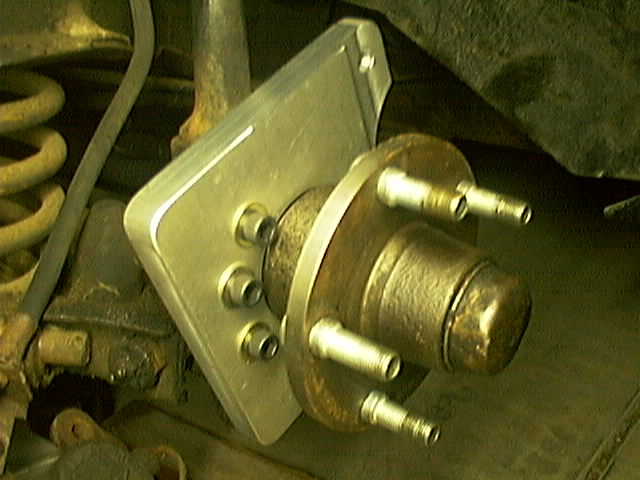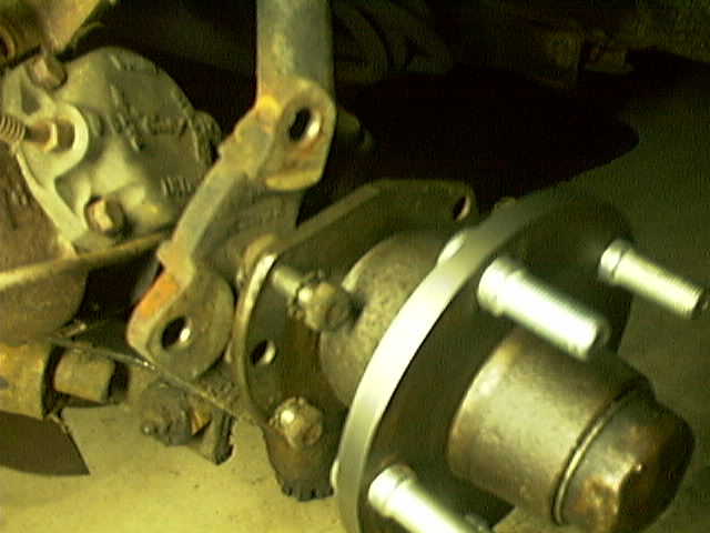 Here is the dinky little bracket that holds the stock Stude caliper in place, it only uses three of the available 6 holes, and mounts on the back side.