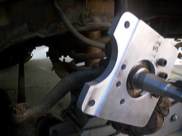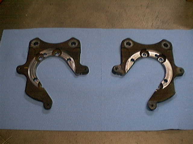 The Ford rear disc calipers are bolted to a bracket which bolts to the rear axle, so modifying this bracket is more simple then starting over. The center hole was enlarged and a "break out" was created so that the bracket could be mounted to the back of the axle flange.
