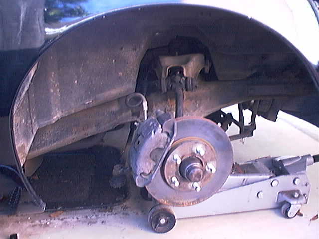 Here is a view from further back, sorry about all the grime and crud, I wasnt in the mood to clean any more then I have too to check fitment. Once I swap out the GT rotor and caliper for the big Cobra stuff, I will scrape and paint everything.