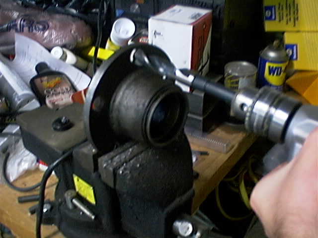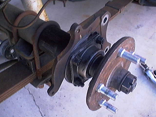 Now I am working on the rear disc setup ... the brackets are done, and on the axle and I am modifiying the hubs with the Dodge wheel studs. The outer dia of the hub doesnt need to be machined down, because the inner dia of the Mustang rotor is larger then the front and the Stude hub is smaller - perfect fit. The rotors actually fit fine, but its recommended to have at LEAST 8 threads of contact on wheel studs and I was at 5 with the stock length studs. I ordered the stock Mustang rear hoses for the setup, because I didnt get those from my friend. I was happy to find that Autozone includes the banjo bolt in the hose kit. Before you laugh, they are nice hoses made by Wagner. Now I have to figure out the plumbing, once I get all the wheel studs in ... had a mishap with one of the 5 studs I COULD get (damn the StupidBowl, most the autoparts stores closed early today!), it contacted the socket that I was using when pressing the stud in, and ruined the threads on the stud.