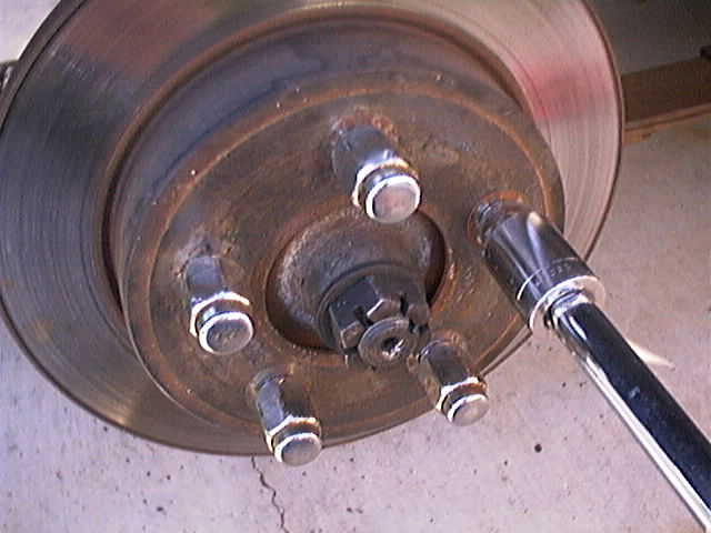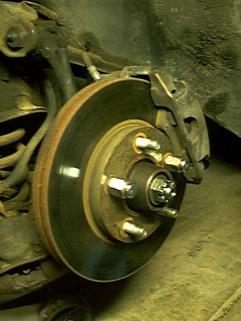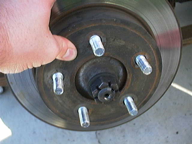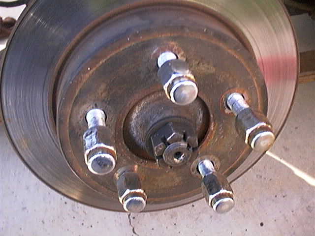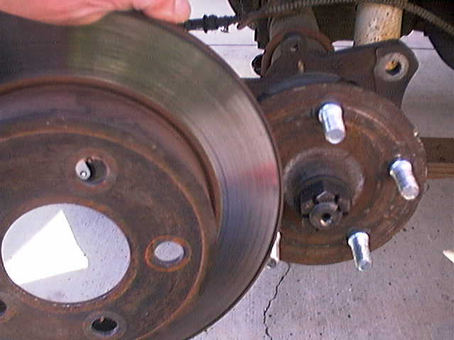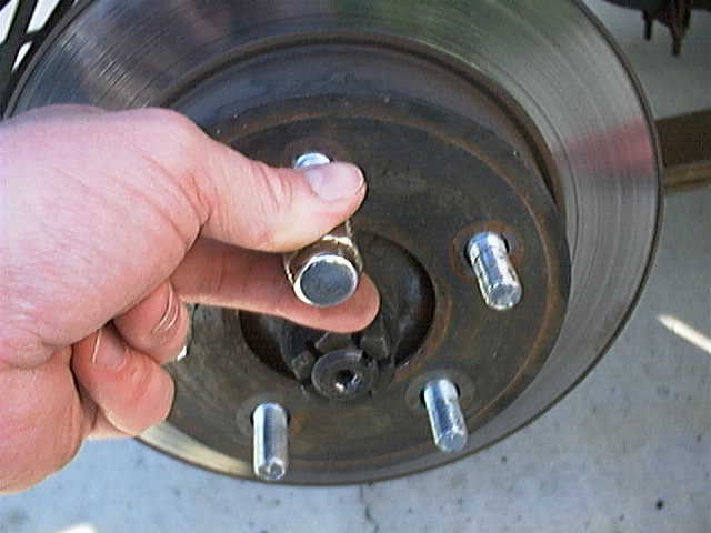 And then tighten the lugs down evenly to "draw" the rotor onto the shoulders of the wheel studs. After you do this, the rotor should stay there, or you can leave the lugs on until the caliper is on. Once the caliper is hooked up and the pedal has been pushed, the caliper will self align, and the pads will hold the rotor in place while the tire assembly is off. To remove the rotor from the hub takes a sharp blow from a rubber mallet.
