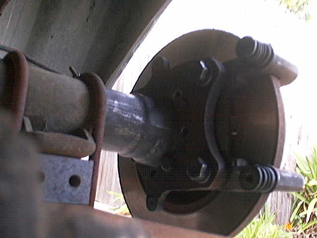 The following pictures show the brackets on the wrong sides, though the way they mount either side is the same. The error was explained above. These pictures came out too good to not use - you get the idea. Here is the 'new' bracket mounted on the backside of the axle flange: