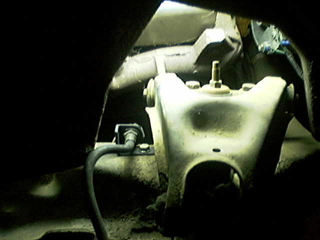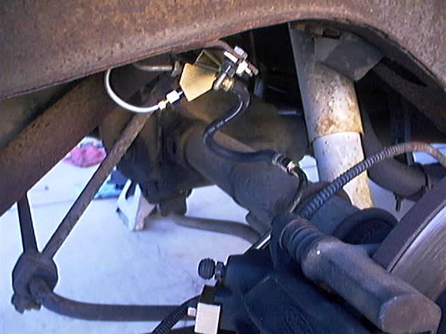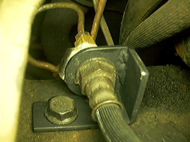After jacking the car up so that the wheels dangled, I figured that THIS would be the "Worst Case" senario for the rubber brake hoses. I would end up trying quite a few different locations and angles of the hose end before decideing on the best position. The hose needed to be able to flex without rubbing anything throughout the travel of the suspension and the turning of the wheel. What a pain! I found that the stock Mustang brackets needed to be 90 degrees from what they were. So I cut off the "business end" and then bought some steel stock. I wanted to use the existing holes in the frame to bolt it down and locate it so that it wouldnt turn.