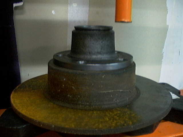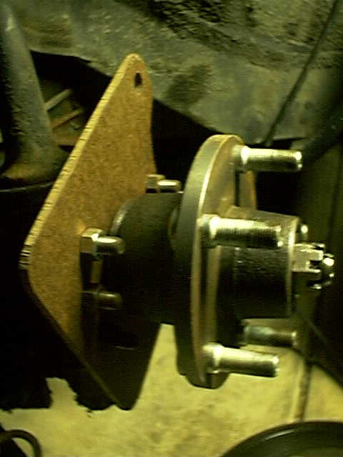 Then we slip the Mustang rotor over the studs (with the metric holes drilled to the next size SAE : 5/8):