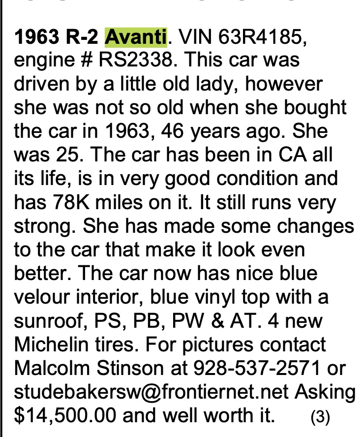 Note: Studebaker Service Letter No. G-1964-3 states in part; "...effective September 1, 1963 ... all new and unused Avanti models when first sold at retail ... will carry the registration year designation of 1964." Ref .