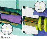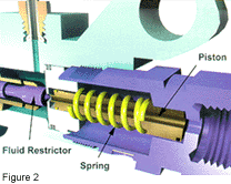This is where the proportioning valve spends most of its life. The spring prevents the piston from moving until a certain pressure is reached. This pressure is known as the knee point. When the vehicle experiences a panic braking situation the system pressure will increase dramatically. When the pressure reaches the knee point it is strong enough to compress the spring. As the piston moves, its opening presses against the fluid restrictor, as shown in Figure 4. This starts to limit the pressure to the rear brakes.