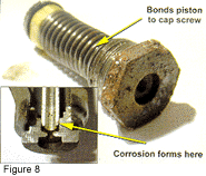The design of some proportioning valves allows two things - more chance for failure and an easy way to diagnose them. If we take a look at the proportioning valve in Figure 6 we will see the cap screw that holds the piston and spring in place is vented. In the vent hole is a small rubber "mushroom" that is supposed to prevent any moisture from entering the cap screw. If this style of valve is mounted low on the vehicle, as in most rear-wheel-drive vehicles, it can be exposed to a high degree of moisture. This is especially true where road salts are used for snow and ice removal. The moisture can corrode the cap screw and allow water to enter into the area where the piston travels in the cap screw (see Figure 7). This causes the inside of the cap screw to corrode which bonds the piston and cap screw together (see Figure 8.). Normally when the cap screw is removed, the cap screw, spring and piston are separate pieces. This corrosion prevents the piston from moving when a panic braking situation occurs.