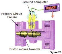If the vehicle experiences a hydraulic leak or failure of either the primary or secondary half of the master cylinder, a difference in circuit pressure will be created. The pressure from the functioning portion of the hydraulic system will force the pressure differential piston toward the side with the pressure loss. The movement of the piston will cause the electrical contact switch to go from open to closed as in Figure 20. This will complete the ground circuit to the red warning light and will illuminate it.