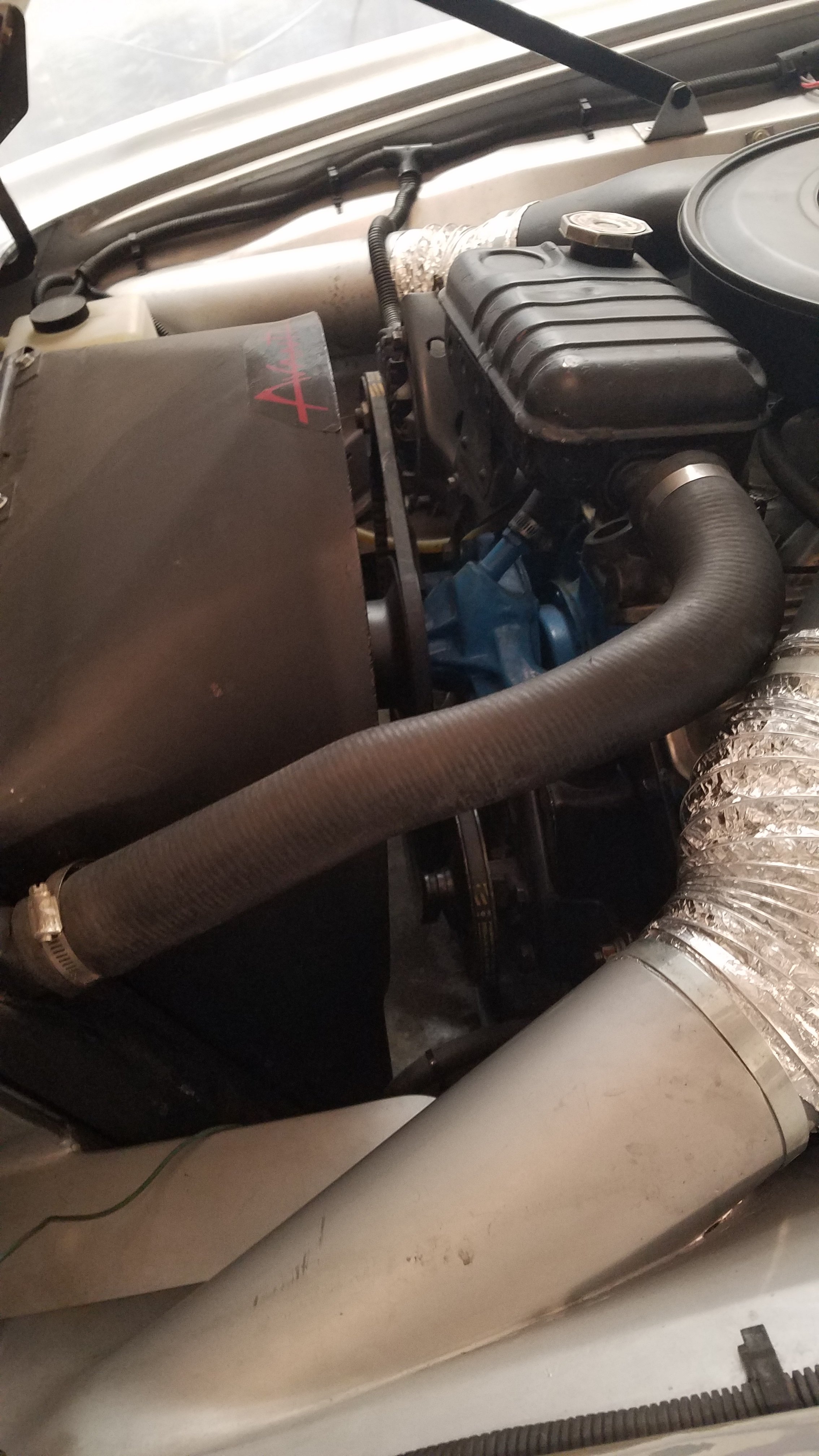 Note the air dam underneath. The openings feed nicely made dual ram air ducts and a dual snorkel air cleaner. Also note the Ford type coolant tank... but there's more! the front wheel well arches are high like a '63.