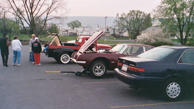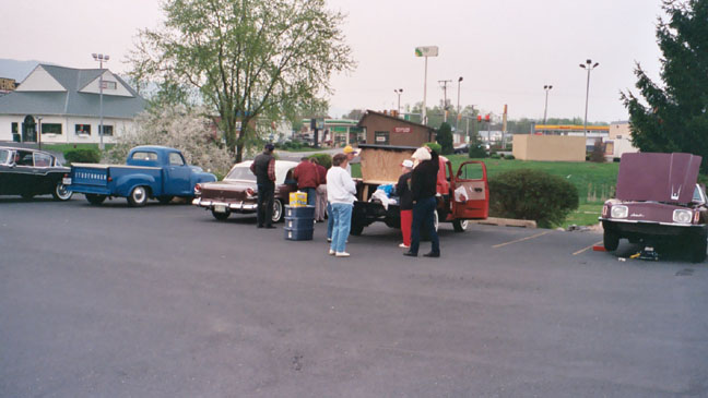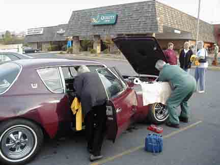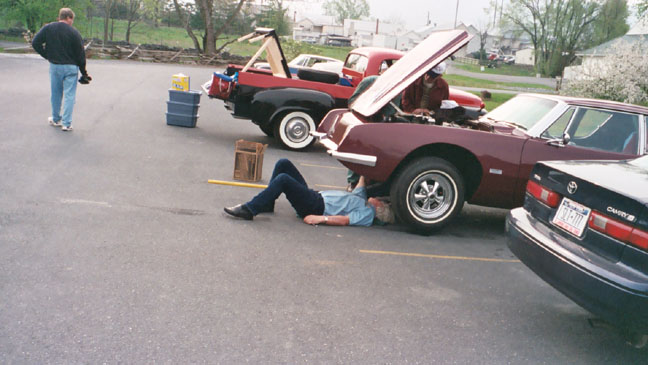 We're supposed to leave around 8AM, however we have to deal with Pauls Avanti. NAPA store opens at 8AM and Frank Philippi drives Paul up to get hoses Norris breaks out his floor jack and we get to work. Frank Fuller lends a hand, Paul returns with a hose-pipe combo and everything is ready by 9:30 |