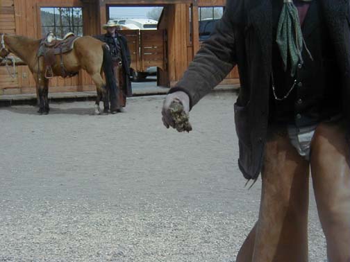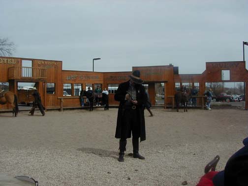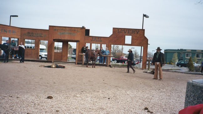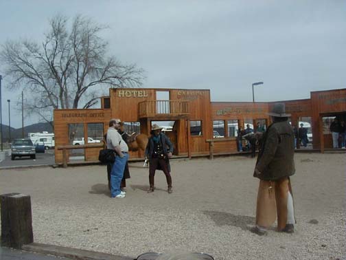 This AM, we take the train to the Grand Canyon State Park. We had to check out of the room at the Fray-Marcos and left most of our luggage at the hotel. The overnight at Grand Canyon only required a small bag. Before the train departed, there was some western entertainment. The actors were great, funny to the bone, etc. One picked up a piece of dried manure and offered it to the crowd, as some of their "horse cakes". In the same breath, he changed the subject, allowing the "cake" to drop out of his hand and walked over to an unsuspecting soul, asked where he was from and shook his hand.... They noted the Studebakers parked in the background and promised not to shoot any holes in them. "If we aim at them, we'll miss, so don't worry". |