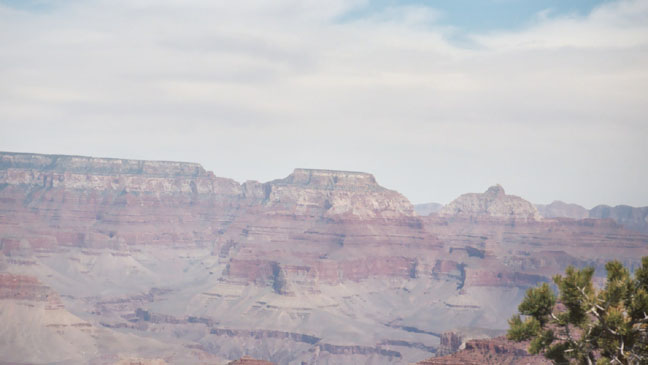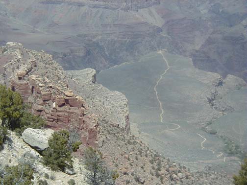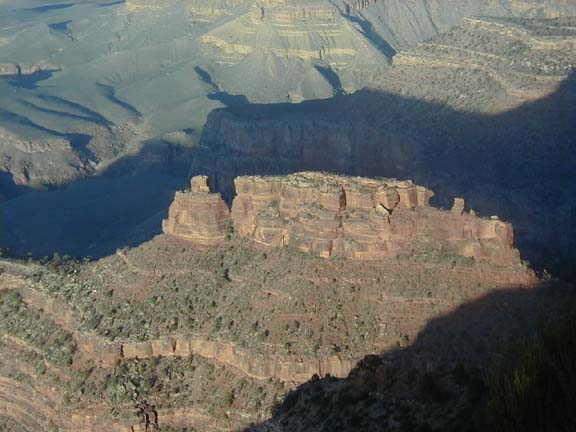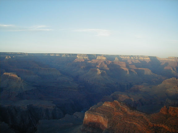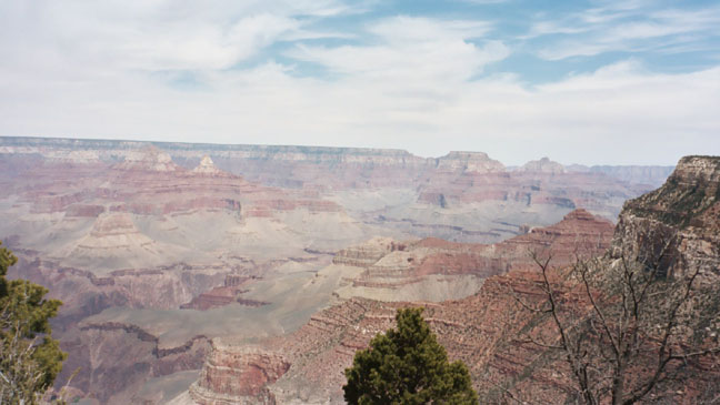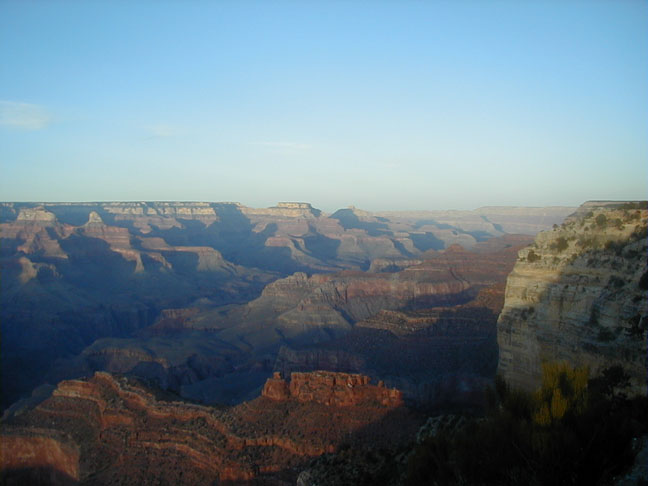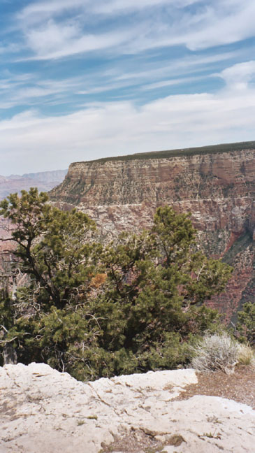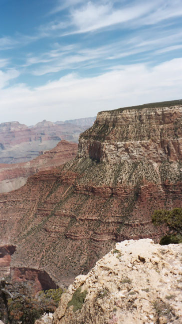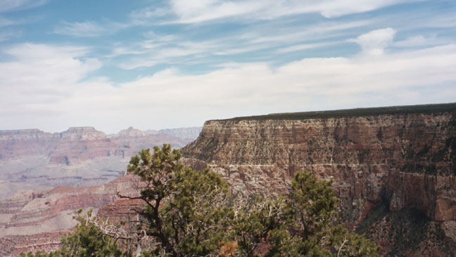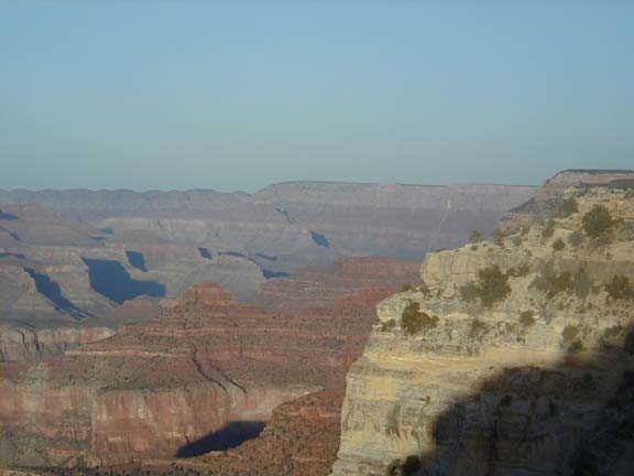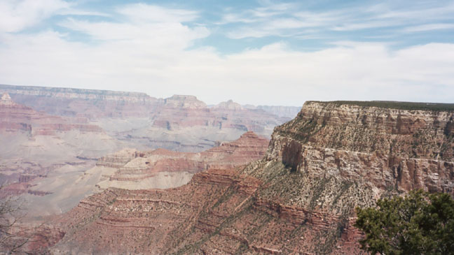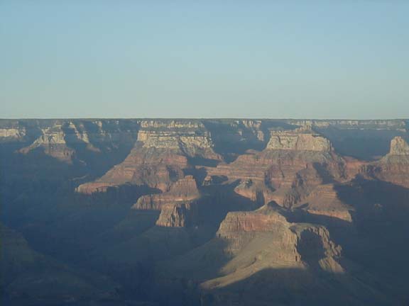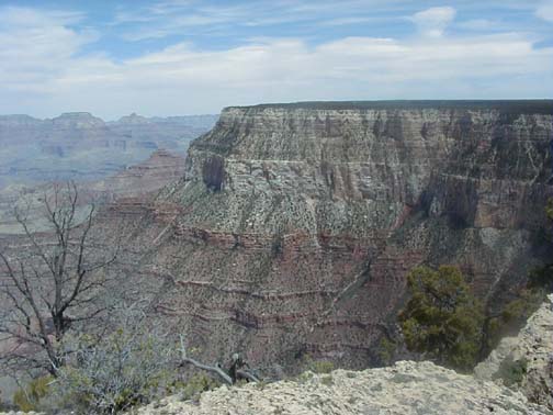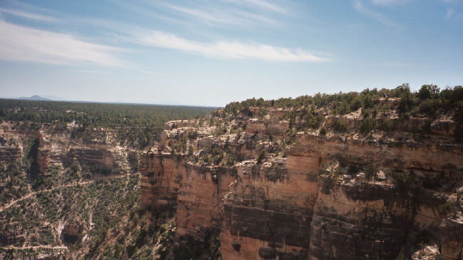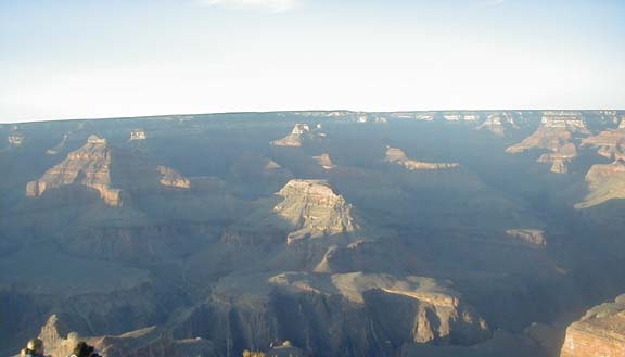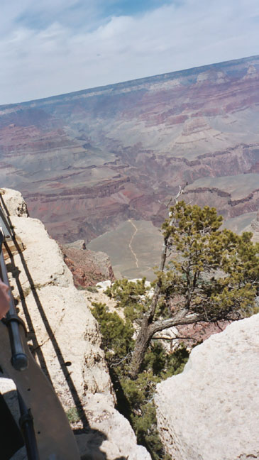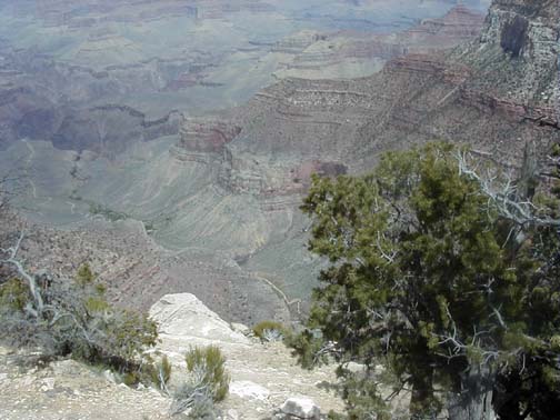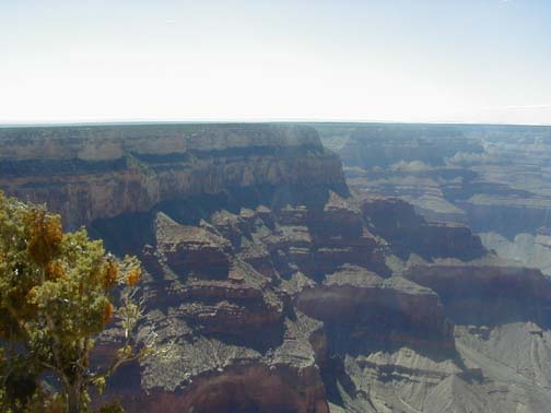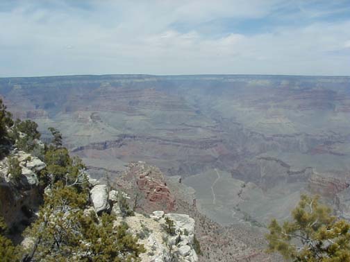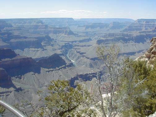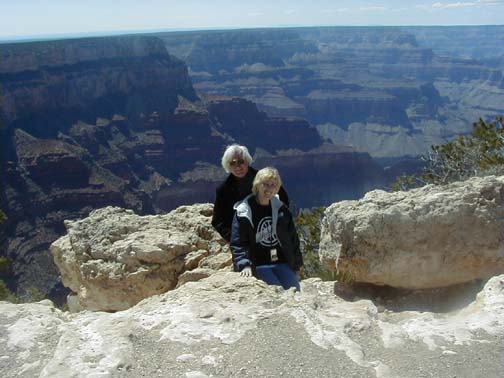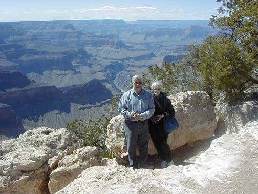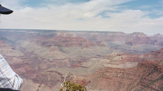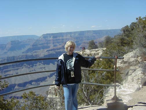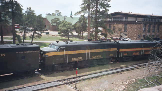 The train pulled into the Grand Canyon resort just before noon and offloaded everyone to a waiting bus for a ride the the Maswick Lodge, where we had lunch. Finishing lunch, we reboarded the bus for a one hour tour of the South Rim. Upon our return, Dave finalized the arrangements for our rooms, which were in smaller buildings outside the lodge. We set out to find them and set up for the evening. |