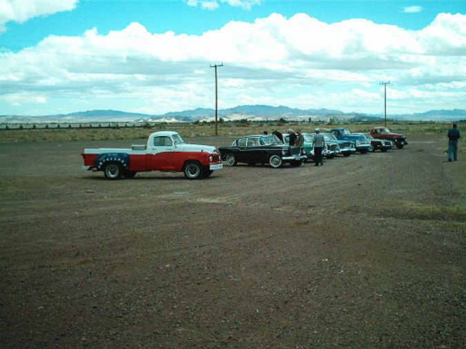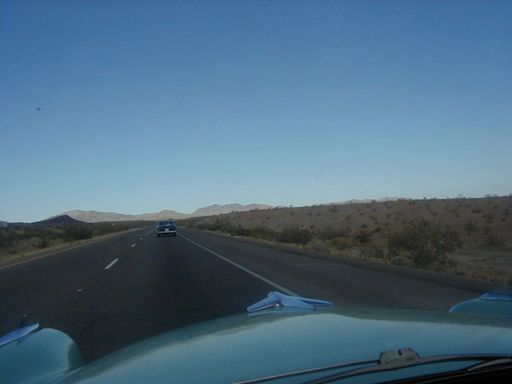 Last night, I received an email from Bob Kabchef, known on the Studebaker newsgroup, as "Studebob". He requested that the caravan meet him along old Route 66, just east of Barstow, so that he could take some video capture of the Tour, as they passed through a rolling section of the old road Dave's brother had also been in contact with Bob and I was elected to do the coordination for the meeting. We departed Needles at 8AM and proceeded along I-40 for a good while. Around 9AM, I started to get cell calls, first from Cecil, then StudeBob to finalize the meeting. We entered old 66 at Newberry Springs and about 5 miles later, right in the middle of the Mojave Desert, see StudeBob's , Stars 'n Stripes, 57 Transtar pickup parked outside a filling station. We stop, greet, chat and Bob asks that we follow him to this isolated secton of 66 near Dagget. After the 'shoot', Bob falls in line with us and we continue on to Victorville, stopping once for a refuel stop. We're on old 66 for a good while, weaving back and forth under the interstate (I-40), getting a close look at how it was 40 years ago. The road is only 2 lanes here and we pick up a couple out-of-state pickup trucks and then an SUV, towing a small house trailer. Not many can pass our caravan, given our slow speed and spread down the road.