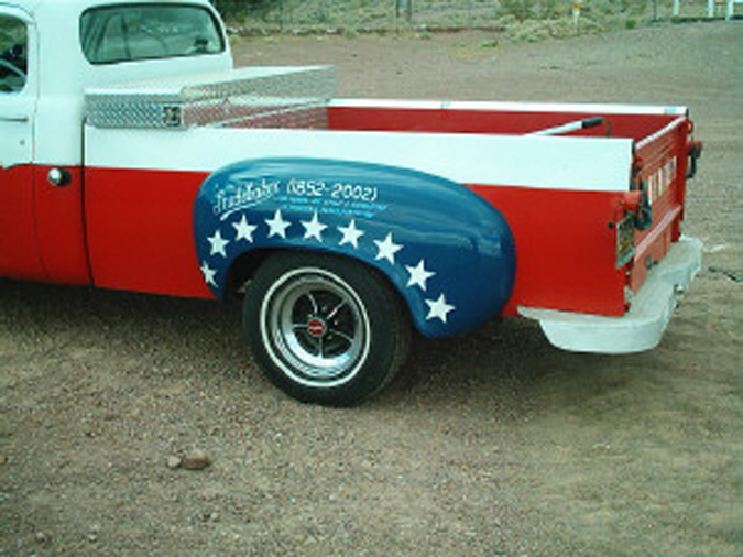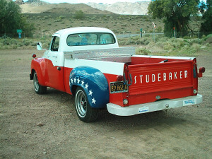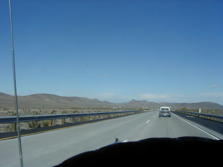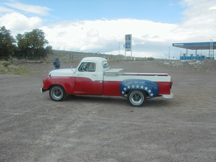 THEN, just east of Barstow, around Newberry Springs, we meet up with Bob Kabchef, AKA Studebob from the Newsgroup Bob drives a 57 Transtar, with a great red, white and blue paint scheme |