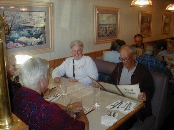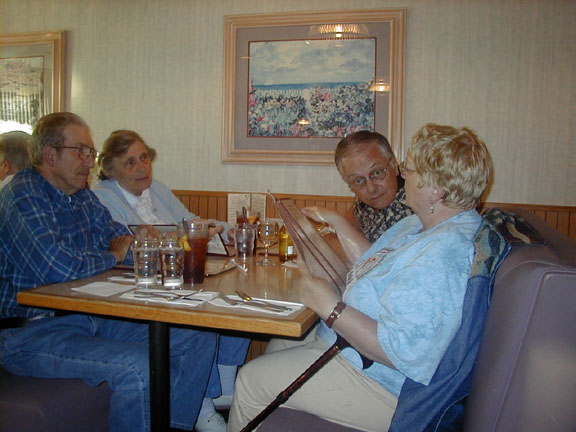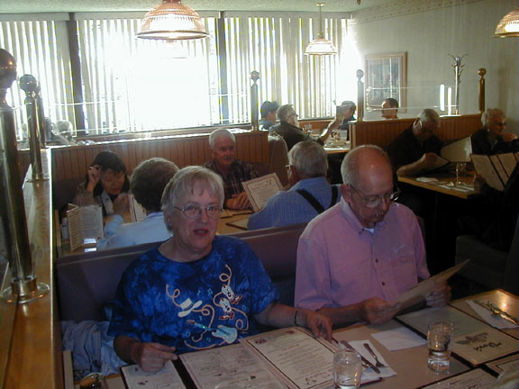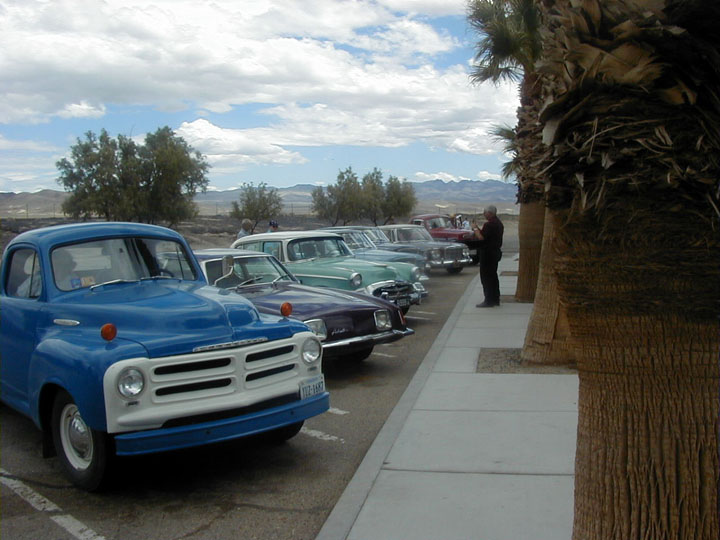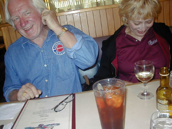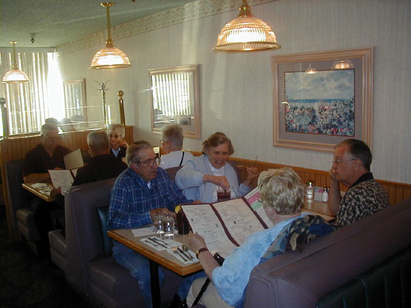 At one point, we took, what appeared to be a regular turn down a spur and follow it for about 2 miles, when, surprisingly, we're at the gate to a military facility and can go no further. Not fettered by this small inconvenience, we all make a U-turn and start to backtrack, then realizing, that the drivers of the odd trucks are somewhat disturbed by this 'turn' of events. They were apparently relying on our navigation. I won't mention what the driver of the SUV vehicle was trying to get across, he had to deal with the trailer....... A bit later, Cecil meets us on the road and we proceed toward Victorville, where he leads us to his house and furnishes a very nice lunch for everyone while we take turns at the lube center A local news reporter with camerman shows up and interviews a few of us. Now we're getting some notariety and we make the newspapers in Chino and San Bernadino Counties. All our cars are done, we thank Cecil and Helen and depart for our Motel for the evening. That night, it's dinner at Dan's Steak House, downtown Victorville