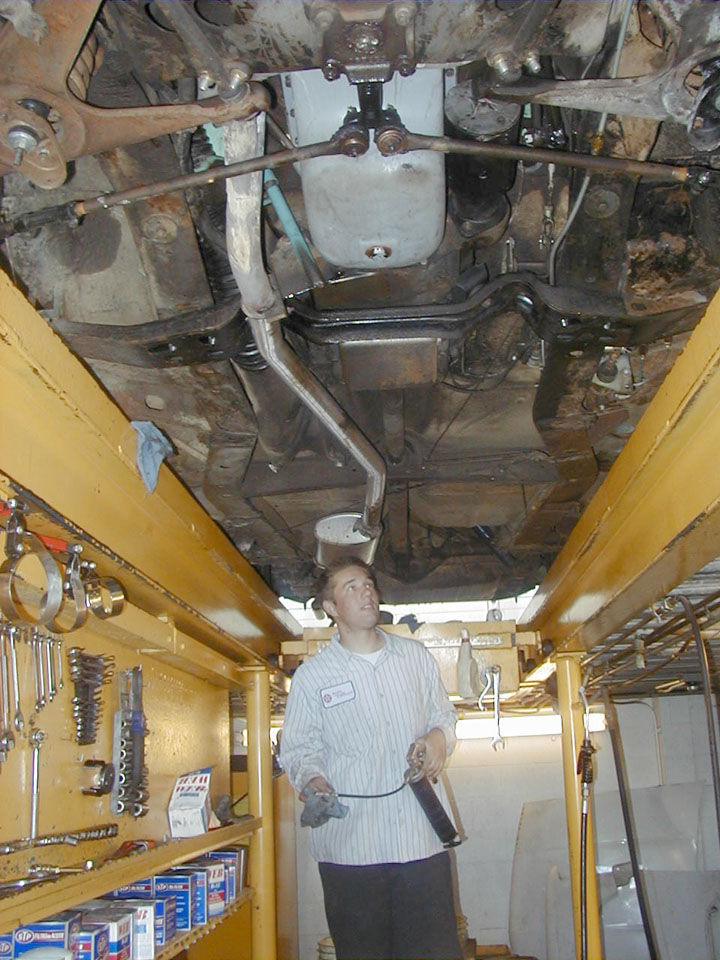 Before dinner, back at the Motel, a young father and his son, are looking over Pauls Avanti and the 55 Pres. They've never seen cars this old, look this fresh. Hesitatingly, the father asks if they can get a ride in one of them, but the schedule is tight and we have to turn them down, in order to find a gas station. Norris needed his wheel bearings tightened, so we attend to that in the parking lot. We also find that his oil pan bolt wasn't tightened enough by the service place. Later on, we tell others to check theirs. |