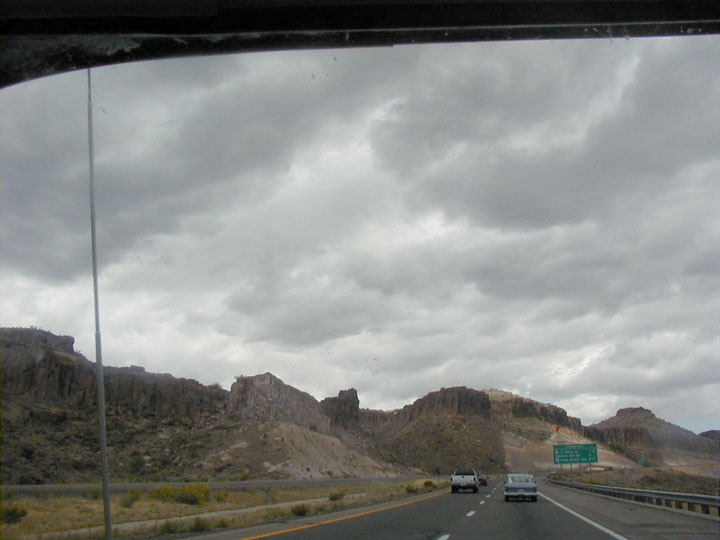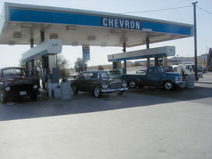 Well, we were relieved that nothing happened to the cars last night :-) . We all arose at dawn, for refuel and breakfast. Norris had a low tire, but was quickly taken care of. Another cool morning, but we're still in the high desert, so it will moderate shortly. |