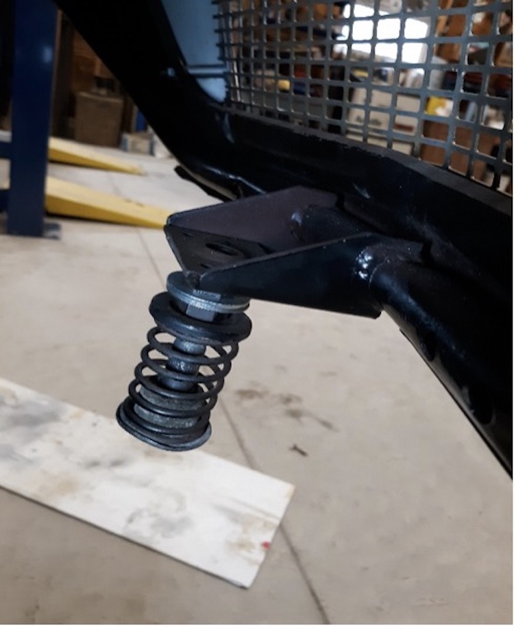 (Thanks Fred!). The object here is to shorten the latch spring assembly so it won’t hit the front bumper/license plate. While you can grind a bit from the hood hinge stops to give you more bumper clearance, every time you do so you’ll move the open hood horizontal resting position forward and further away from the hood receivers!