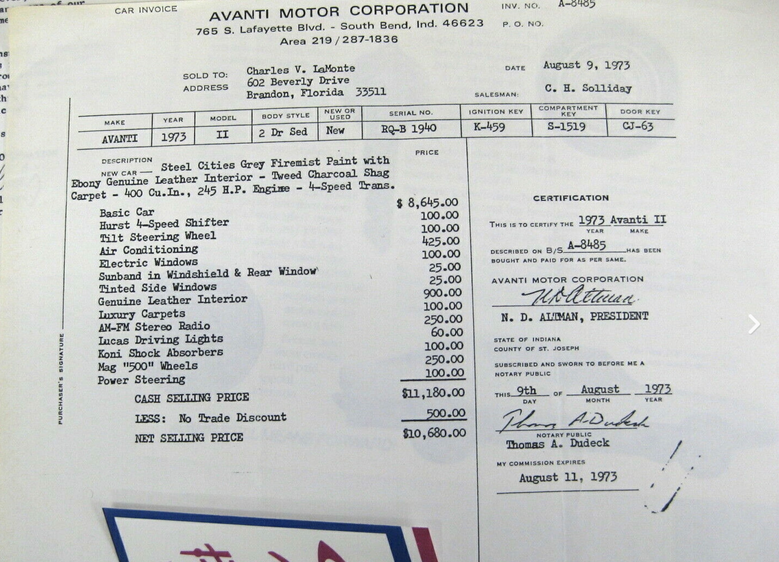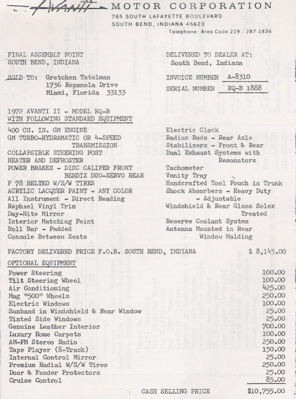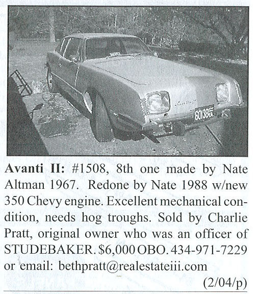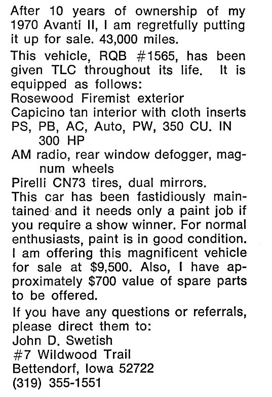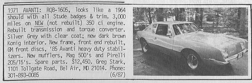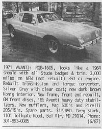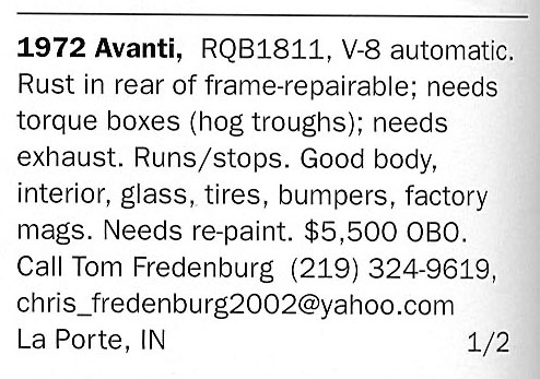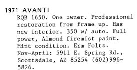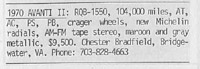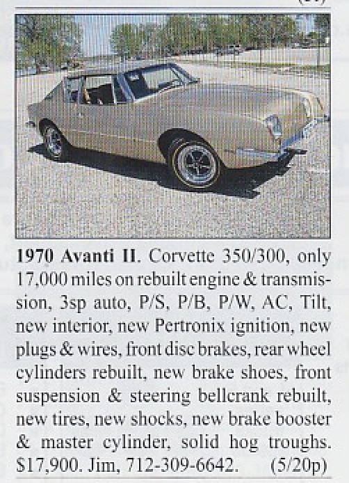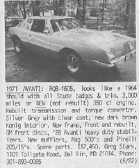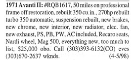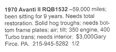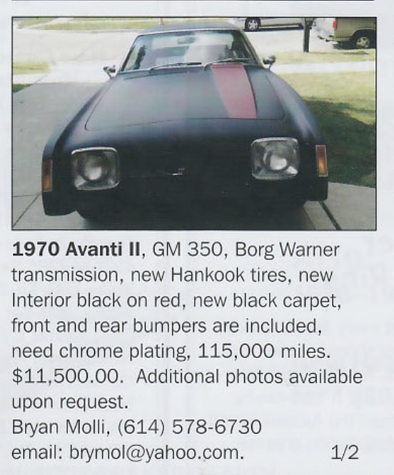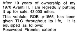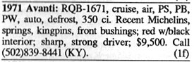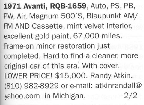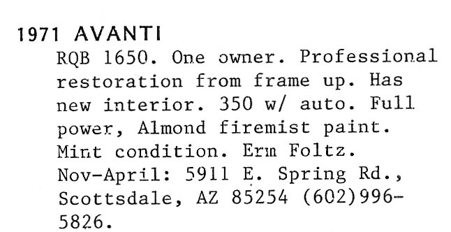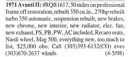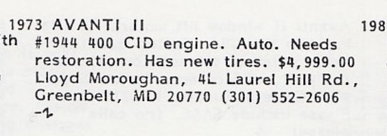 NO IDEA whatever became of it. It has NO SPECIAL DESIGNATION -- so you 1974-77 Avanti II owners, grab your tape measures!")