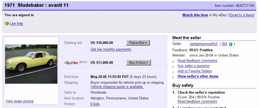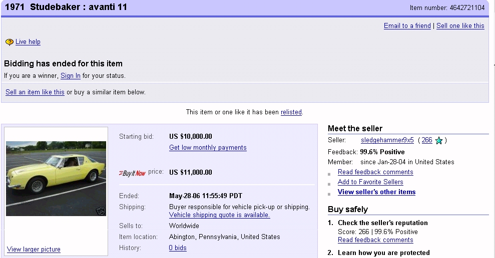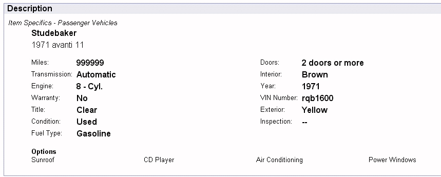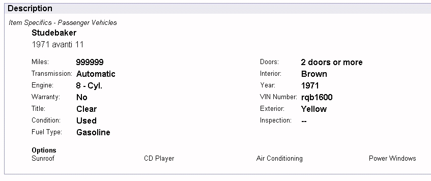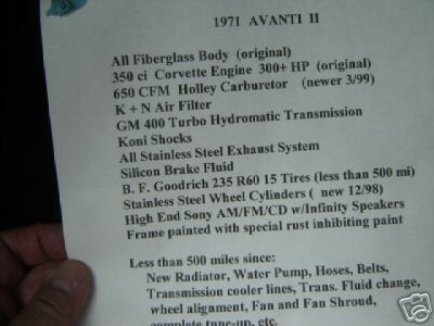 Up for sale is a 1971 avanti 11, that is turn key, and runs perfect. she is fully equipped, and has a 350 engine&a 400 turbo trans.this car runs perfect&shifts on a dime, and truely hauls!! The car has new tires,stainless steel exhaust,new radiator,fresh tune-up,holly carb, i forgot to mention it has a 1971 vette motor in her, everthing works except the clock, its probably afuse, the car has a/c, but i never tryed it, the exterior is quite descent, it looks like someone tryed to repaint a part of the car&didn't match it to well&the bumpers could could use redipping, there are small spiders on the body-here& there. there are pop up sun roofs on her, that open&close perfect, i have tons of receipts with the car&parts catalogs, this is a car you can drive as is, no problem, or invest very little into&show her, there were 8500 total made& as far as i am concerned-1971 was the last good year for any muscle car-period, so for the price you get acollectible& a car that flys, you can take your hands off the steering wheel at 90mph, an there is no shimmy, so bid with confidence&look at my feedback. I am a straight shooter, and old harleys&muscle cars are my passion, i will require 500.00 at the immediate end of the auction in my pay pal, and the balance wired into my bank account within 72 hours, no exception, the deposit is non-refundable, so feel free to ask any&all question, there is no such thing as a stupid question to me. has new sony cd-radio in glove. |