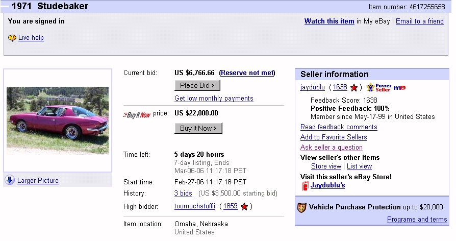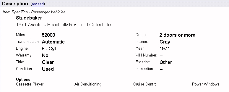 1971 Avanti II A fully-restored example of a landmark design After Studebaker ceased U.S. production in December, 1963, the rights to continue building the Raymond Leowy-designed Avanti were purchased by Avanti Motor Corporation. They continued to build this classic fiberglass GT coupe in South Bend between 1965 and 1982, with the only significant changes being the replacement of the Studebaker power train with a Corvette 350 short-block engine and turbo 350 transmission. Former Studebaker craftsmen hand-built 107 of these 1971 models. This one sold new for $9,640 including the following options: power steering, electric windows, tinted windshield, AM/FM radio with tape player and rear seat speakers, electric antenna, magnum "500" wheels, boat hitch (never used), premium white sidewall tires, decorator fabric interior, and luxury carpet. The current owners purchased the car in 2001 following its complete ground-up restoration. The owners have detailed photos of the restoration process. This restoration process included: Engine: complete rebuild including the addition of a high performance oil pump. Transmission: complete rebuild. Electrical: repaired as necessary, replaced charge system w/single wire Delco, rebuilt starting system and distributor. Cooling System: installed new high flow radiator, new hoses, new water pump, 6-blade high pitch fan, and viscous clutch. Fuel System: rebuilt Edelbrock Quadrajet carburetor, new electric fuel pump and fuel lines, and repaired/cleaned/resealed fuel tank. Brakes: rebuilt calipers and rear wheel cylinders; replaced front rotors and brake pads, brake shoes, all brake lines, and converted entire system to DOT 5 silicone fluid. Suspension: rebuilt entire system and installed new rear springs. Body: following bead-blasting, all stress cracks were repaired/reinforced. Numerous applications of gelcoat, epoxy primer and paint were applied with block sanding and 30-day drying cycles between each application. New undercoast then added. Frame: after bead blasting rear half of frame was replaced. Front assembly was repaired and epoxy primer and paint were applied to entire frame. Torque boxes were cleaned and treated with rust preventative. Exhaust System: replaced complete system and installed evaporative canister. Interior: installed new windshield and custom interior (including trunk) rebuilt Recaro seats and power window motors and mechanisms. Added seat belts. The sellers have owned this beautiful personal luxury car for almost five years and it now has about 5,000 miles on the complete restoration. They have driven this car throughout the eastern Colorado region with no problems whatsoever. The car has always been garaged out of inclement weather. It never fails to attract lots of attention at car shows and cruises due to its classic design, gorgeous raspberry-colored paint (Iris), and immaculate condition inside and out. The current owners recently purchased a 2002 Avanti and must make room for it in their garage. Otherwise, they would never part with this super nice 1971! The new owner will also receive several Avanti shop manuals, many miscellaneous spare parts, a hood bra, touch up paint, etc. Questions? Please call owner Phil Scott at (303) 972-3575 or email Terms: Seller to receive 10% of final selling price from winning bidder within 3 business days by bank wire transfer or cashier's check (or cash in person). Balance to be paid by bank wire transfer or cashier's check (or cash in person) within 7 days of auction's end. Bank wire transfer or cashier's check must clear before transaction is final and for car/title to be released for pick-up either in person or to shipping carrier. Buyer to make and pay for any shipping arrangements. Seller will work with buyer's carrier in loading. This Avanti II is sold as is/where is with no warranties or quarantees made or implied by the owners or the listing agent for this car. This vehicle is being listed for the current owners by Jaydublu's in Omaha, Nebraska. This car is located in Littleton (Denver area) Colorado. Serious bidders only from the U.S. and Canada. |