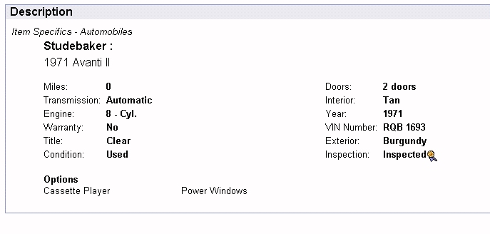 1971 Avanti II I bought this car in Nov 1999 from a collector who had purchased it in Arizona. Previous owner had repainted the car. I drove it from Michigan to Connecticut. Since that time I have replaced all gauges with original Stuart Warner parts (Tach and odometer were not working, and other gauge faces were faded), replaced the starter, battery, rebuilt the Carburetor, replaced the water pump and had it serviced regularly and stored winters. It has Burgundy paint with a light tan interior. The interior is in clean condition. VIN Number: RQ-B 1693. (Connecticut does not Title cars over 25 years Old) • Total Mileage Unknown. Odometer was not working when I bought it. (Since replaced.) I have put a few thousand miles on in the past 5 years • Chevy Corvette 350 c.i. V-8. Dual exhaust with glass packs. (The car is loud - and there is a leak on the right exhaust. (If I were keeping the car I would replace the exhaust system - the previous owner liked loud cars) • 3 speed Auto • Air Conditioning not functioning (A hose let loose last summer) • Power windows (Drivers side window needs a roller to keep it on the track - it works but may need manual assistance at times.) • Power steering, power brakes, original rear window defroster (fan) • Tires are currently black side wall from a BMW 5 Series - Good rubber on all tires but the car would look better with the correct White Side Wall tires. • The Hog troughs are in great condition. • There is a small tear in the fiberglass where the front right bumper connects. (I hooked another cars bumper backing into a parking spot) The car is garaged in Danbury, CT. .. contact me with any questions at OnBudget@aol.com!