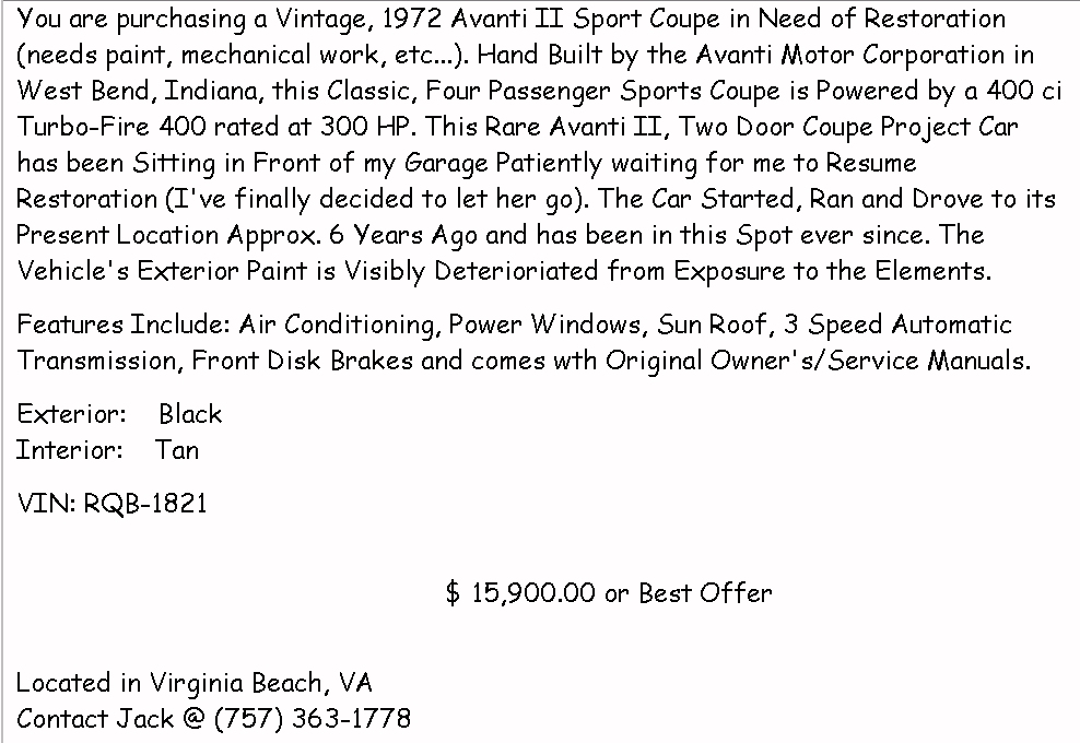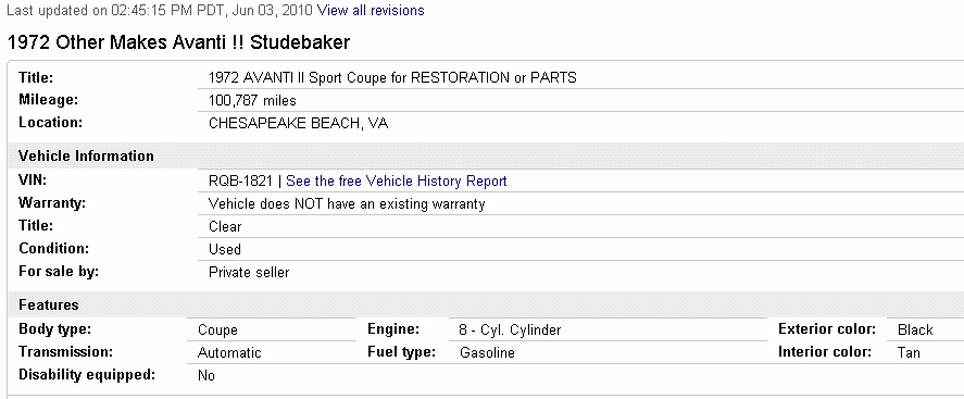 Bob's Studebaker Resource Website 1972 Avanti II , RQB-1821