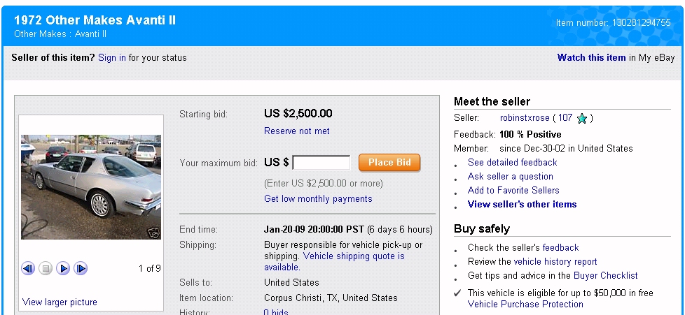 1972 Avanti II RQB-1835 Listing Jan 2009